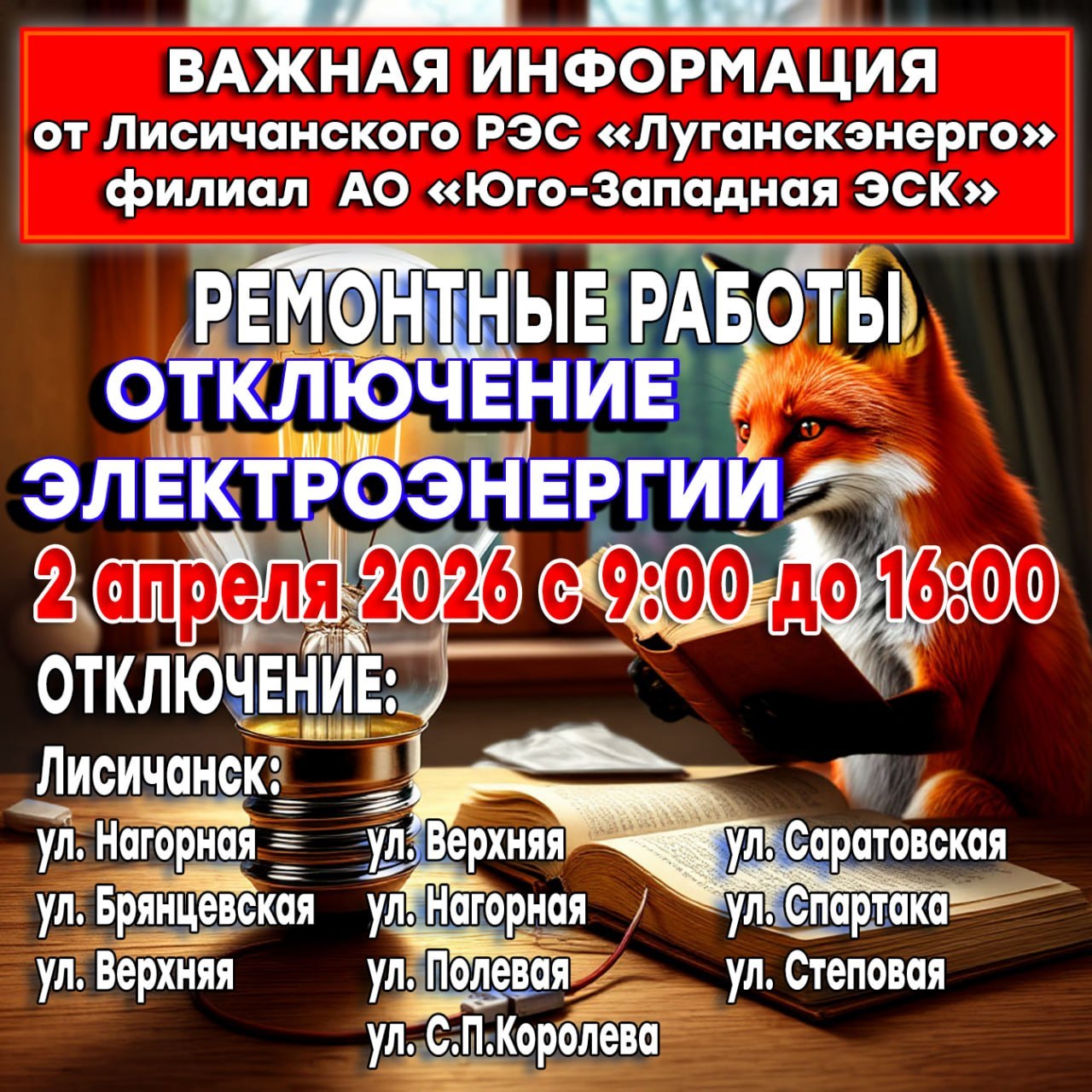 Лисичанский РЭС «Луганскэнерго» филиал АО «Юго-Западная ЭСК» информирует потребителей о плановом отключении электроэнергии в связи с ремонтными работами!