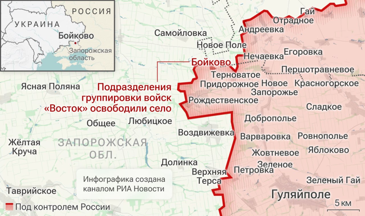Также российские войска освободили Верхнюю Писаревку в Харьковской области и Бойково в Запорожской области.