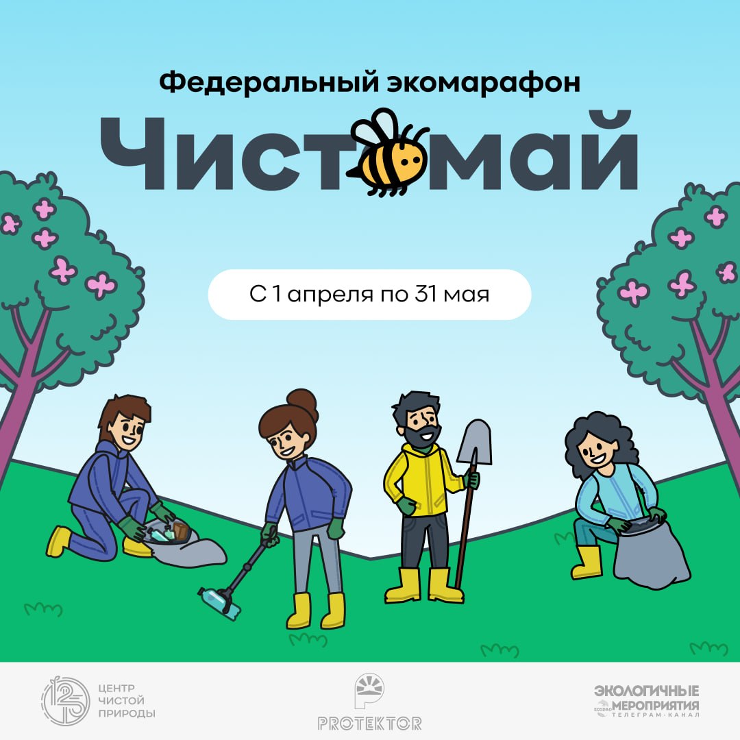 С 1 апреля по 31 мая 2026 года в Российской Федерации проводится Всероссийский экомарафон «Чистомай-2026» – призванный доказать, что привычные субботники и уборка на природе это не повинность, а творческое мероприятие с друзьями, семьей и единомышленниками. Также это вклад в достижение целей национального проекта «Экологическое благополучие», который с 2025 года объединяет усилия по ликвидации свалок, сохранению лесов и развитию экологической культуры по всей стране.
