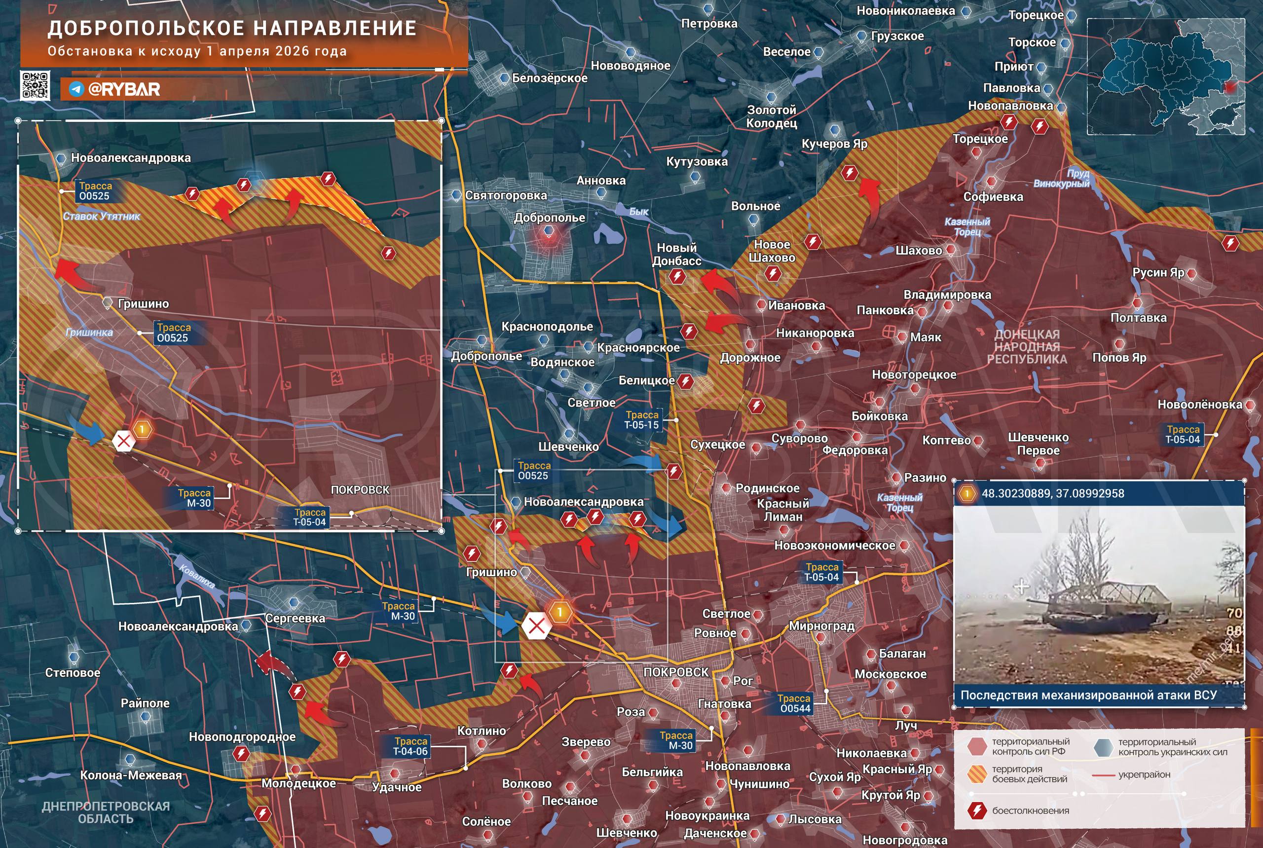 На Добропольском направлении ВСУ предприняли контратаку к югу от Гришино, однако не достигли успеха и потеряли несколько единиц техники и штурмовых групп. В то же время российские подразделения постепенно продвигаются в районе Родинского.