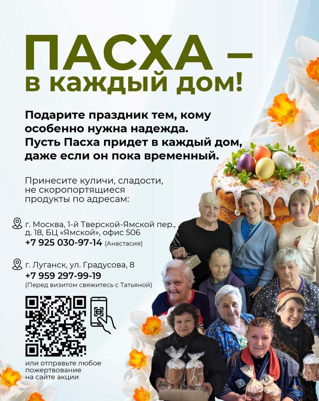 Офлайн в Москве и Луганске. Вы можете передать продукты и подарки лично, а мы соберём из них пасхальные наборы по адресам: