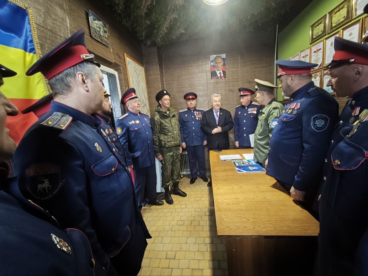 В Лутугинском муниципальном округе состоялась встреча депутата Государственной Думы РФ, казачьего генерала Виктора Водолацкого с казаками СКО "Станицы Лутугинской". Встреча прошла в штабе казаков, где хранятся трофеи вражеских беспилотников, которые уничтожают наши казаки во время дежурств. Во встрече принял участие член Общественной палаты ЛНР, атаман Станичного казачьего общества «Станица Лутугинская» Андрей Колесниченко.