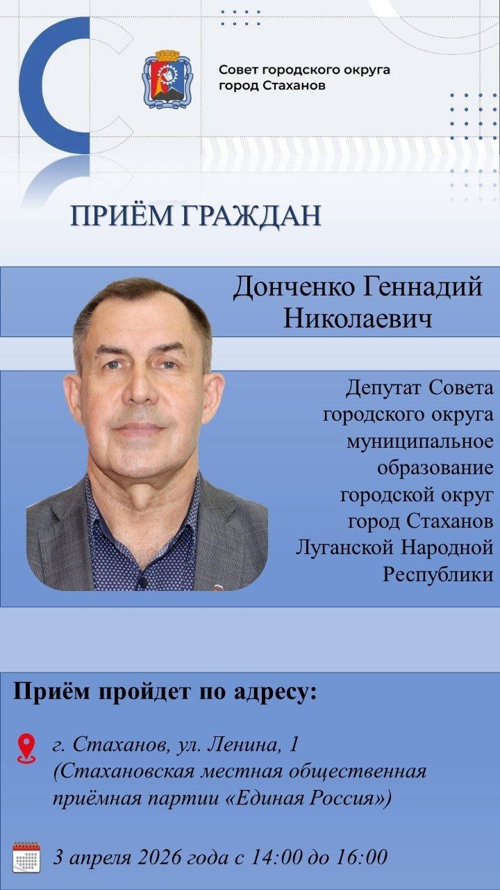 Личный приём граждан депутатом Совета городского округа город Стаханов Донченко Геннадием Николаевичем