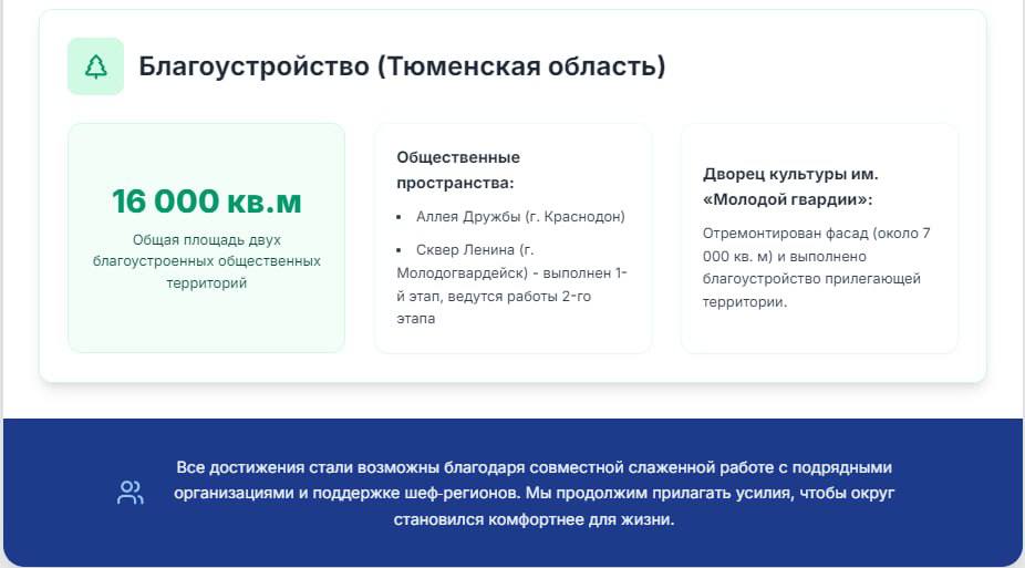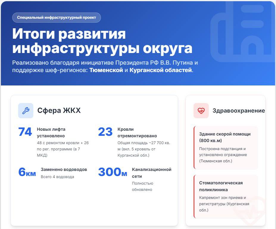 При поддержке Тюменской и Курганской областей была проделана работа, затронувшая ключевые сферы жизни: от модернизации ЖКХ и здравоохранения до ремонта дорог и благоустройства общественных пространств.