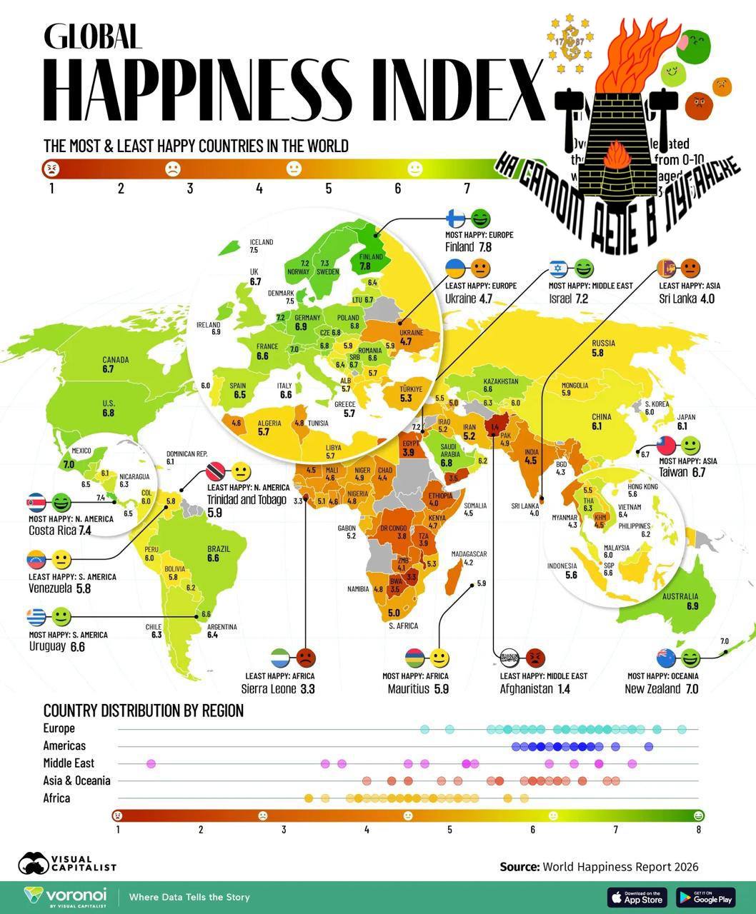 Самой счастливой страной остается Финляндия (7,8), за ней следуют Исландия, Дания, Швеция и Норвегия.
