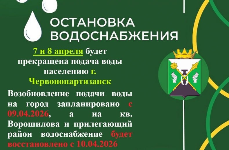 В связи с необходимостью проведения аварийно – восстановительных работ 07.04.2026 и 08.04.2026 будет прекращена подача воды населению г. Червонопартизанск