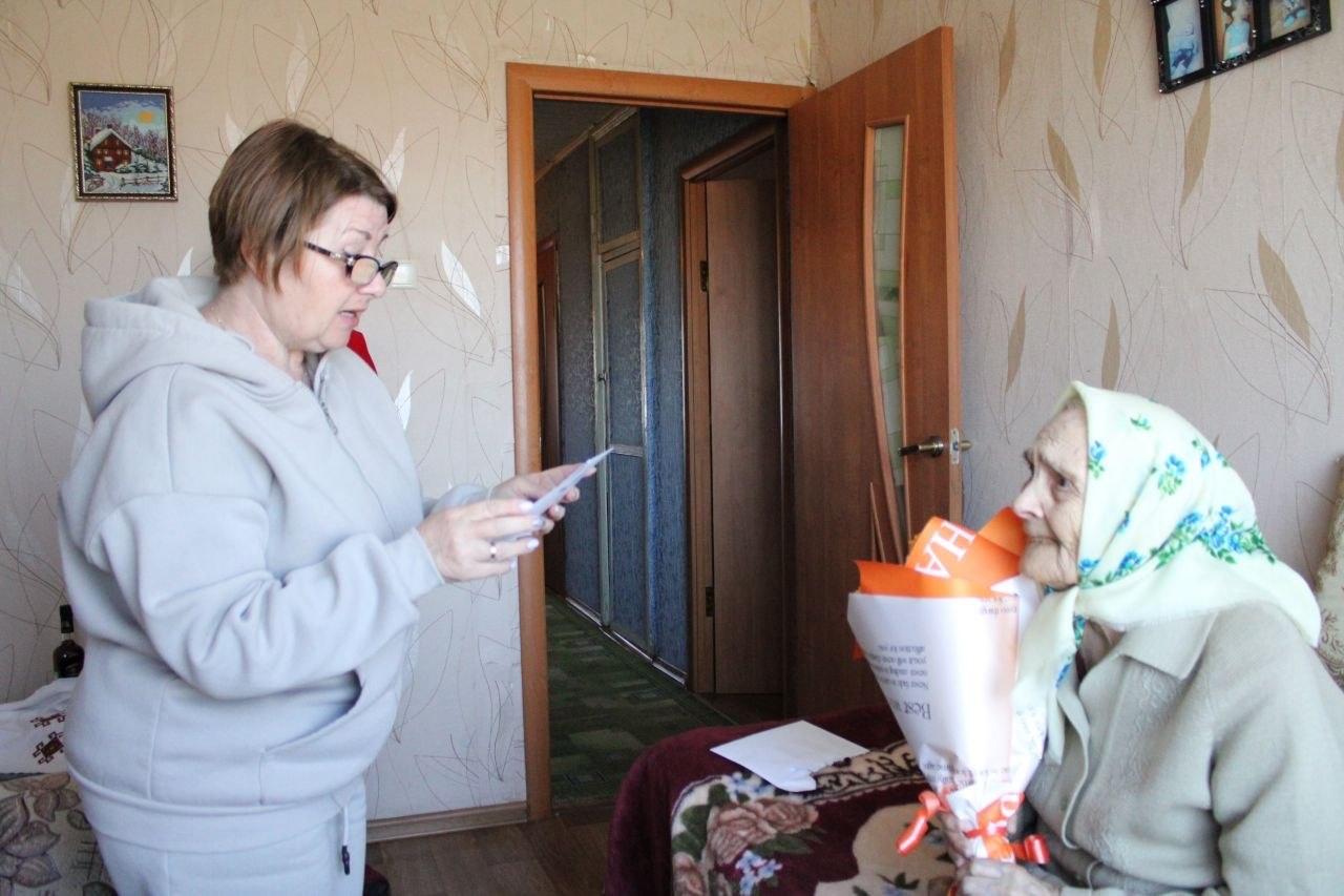 В честь именинницы прозвучали теплые слова и пожелания. Евдокии Ивановне были преподнесены цветы и сладкий подарок.