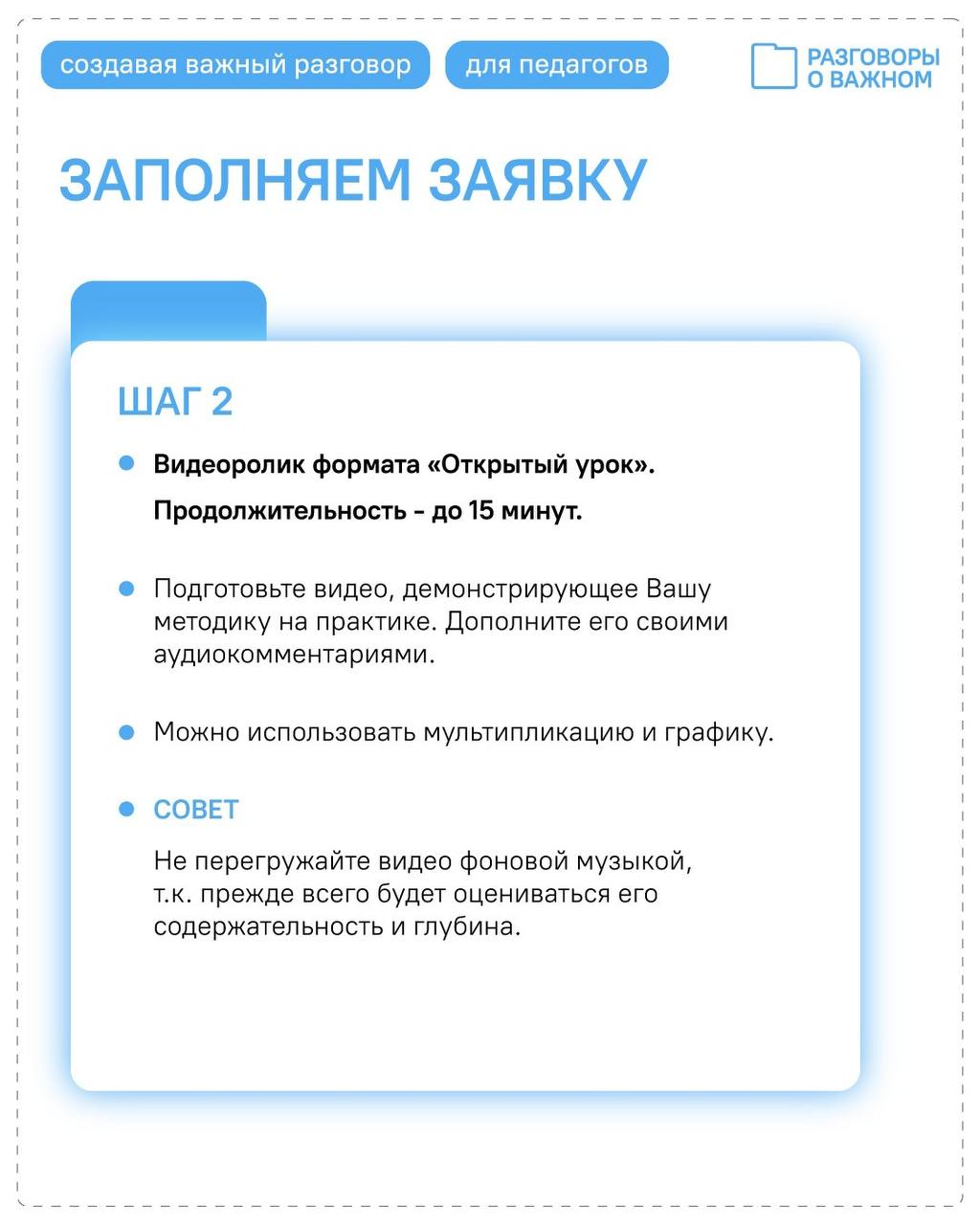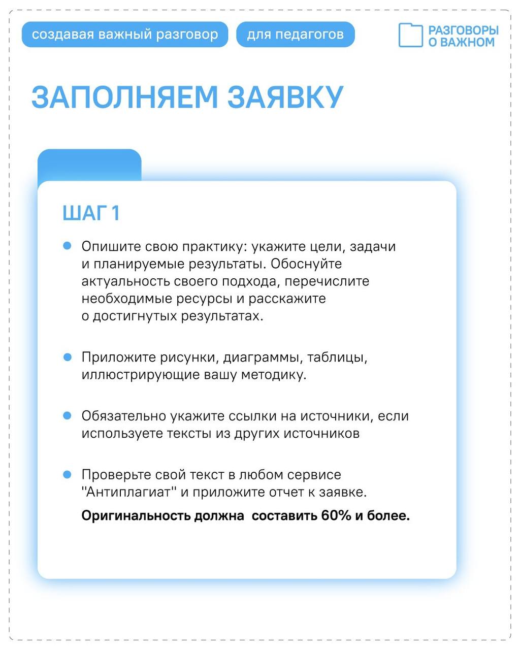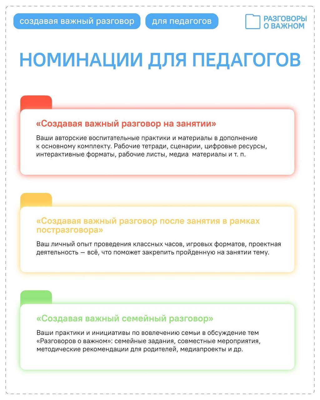 Участие в конкурсе – это отличный шанс: поделиться своими уникальными подходами со всей страной, внести вклад в развитие проекта «Разговоры о важном», получить признание от своих коллег.
