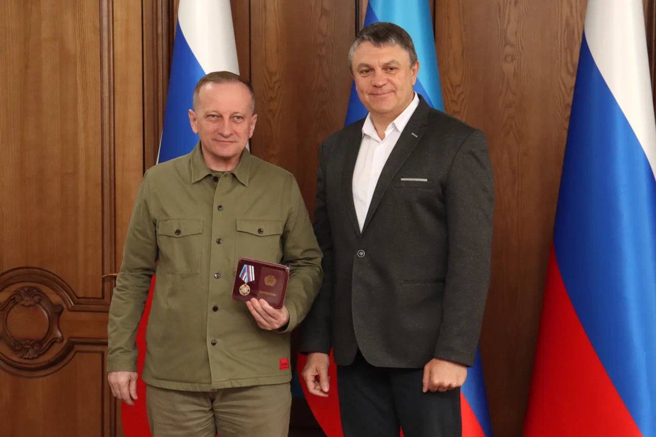 В торжественной части встречи Леонид Пасечник вручил Эли Исаеву почетную награду ЛНР - медаль «ЗА ЗАСЛУГИ» I степени.