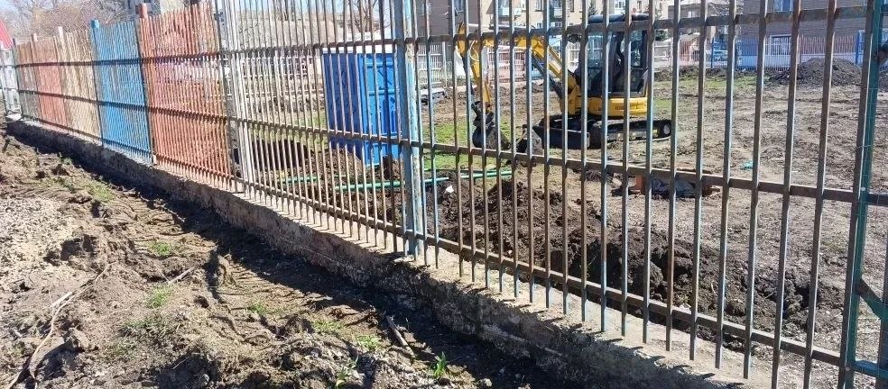 На сегодняшний день на объекте проводятся работы по очистке металлического ограждения и планировка территории.