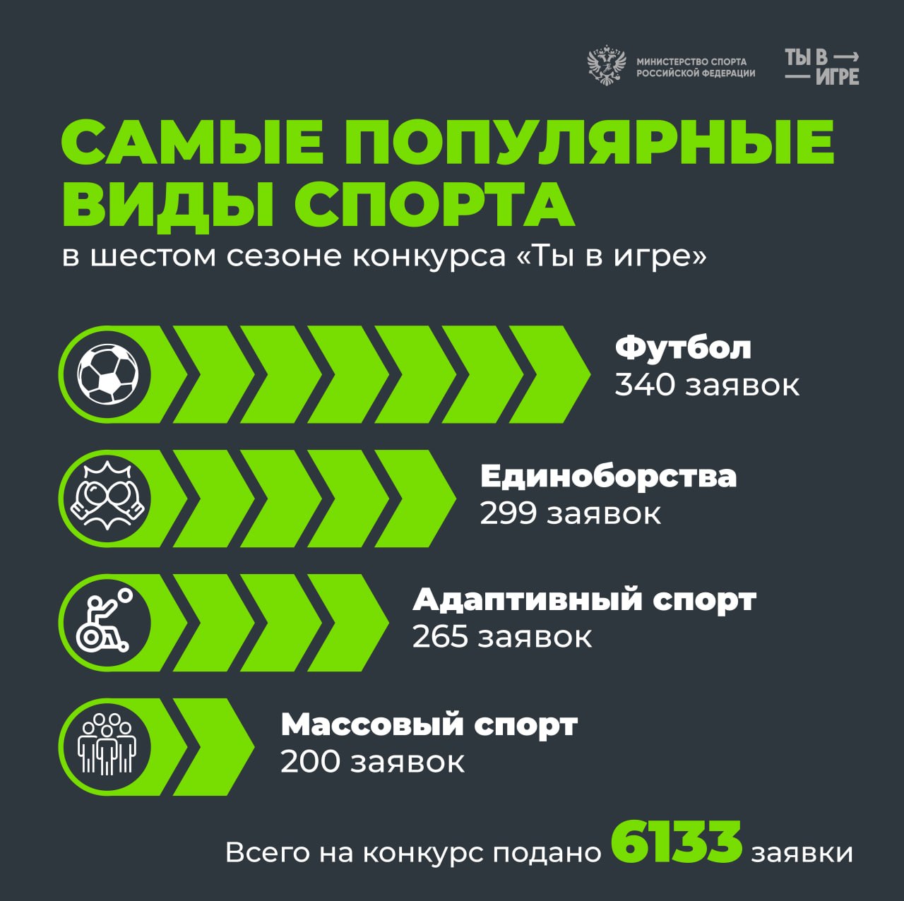 В шестом сезоне принимают участие целых 6133 проекта — на 550+ больше, чем в прошлом. Мы очень рады, что любительский спорт в нашей стране развивается и становится популярнее, а число инициатив растет. Скоро мы продолжим рассказывать про самые интересные из них, а пока немного статистики. Начнем с самых популярных видов спорта на конкурсе — вынесли их на карточку