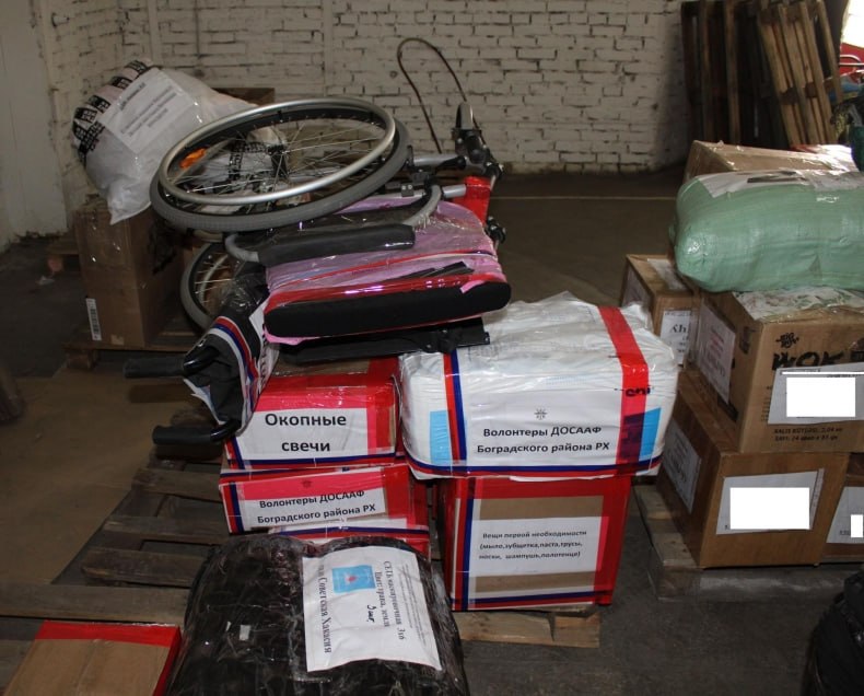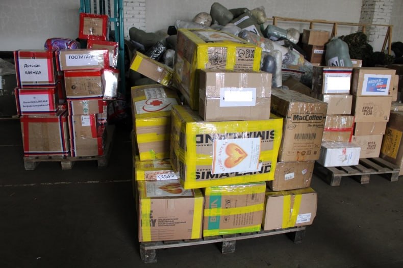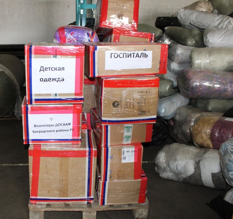 В пункты временного размещения подшефных населённых пунктов ЛНР и ДНР направлены: одежда для взрослых и детей, игрушки для детдомов, собачий корм приютам для животных, в госпитали – инвалидные кресла-коляски, медикаменты.