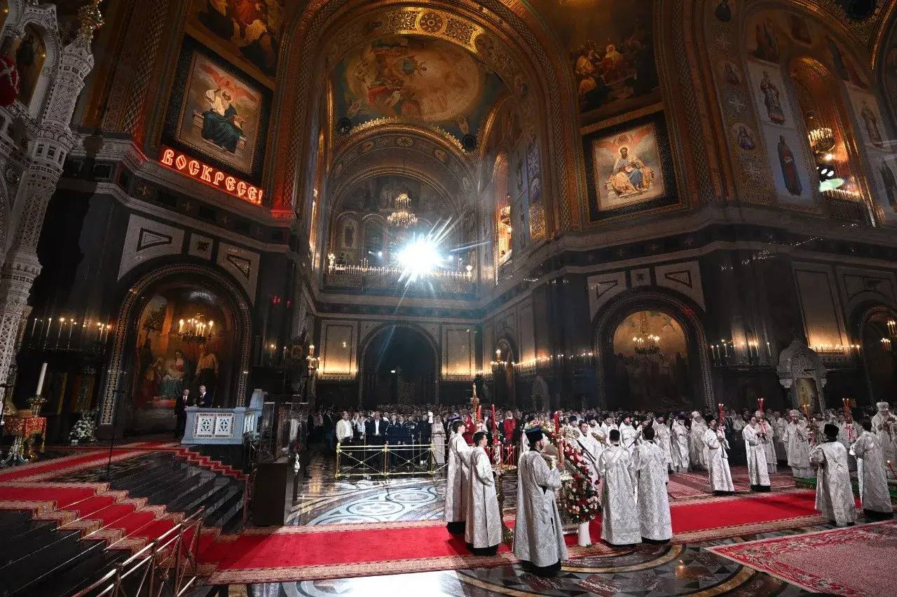 Президент посетил ночное пасхальное богослужение в храме Христа Спасителя вместе с мэром Москвы Сергеем Собяниным. Службу провёл Патриарх Московский и всея Руси Кирилл