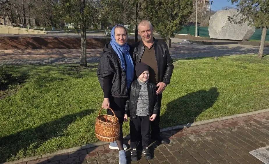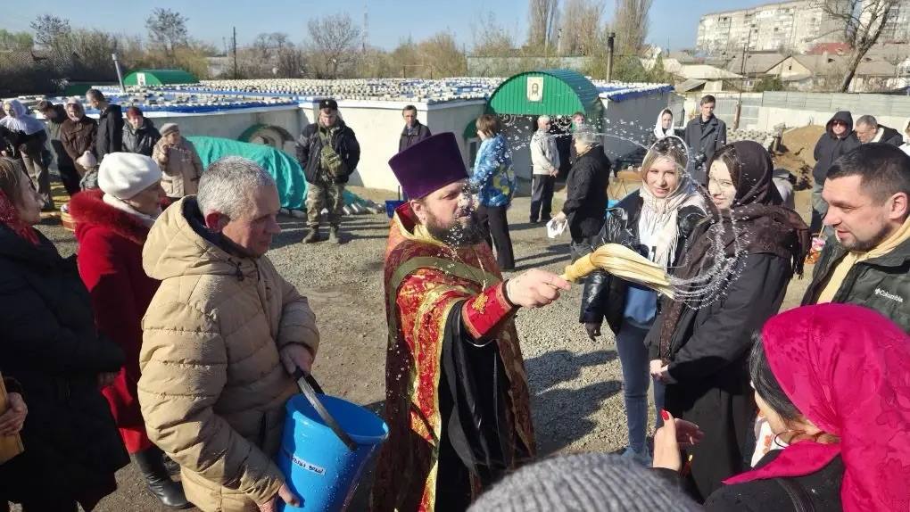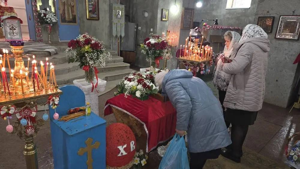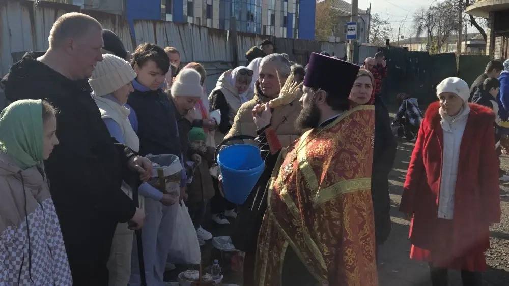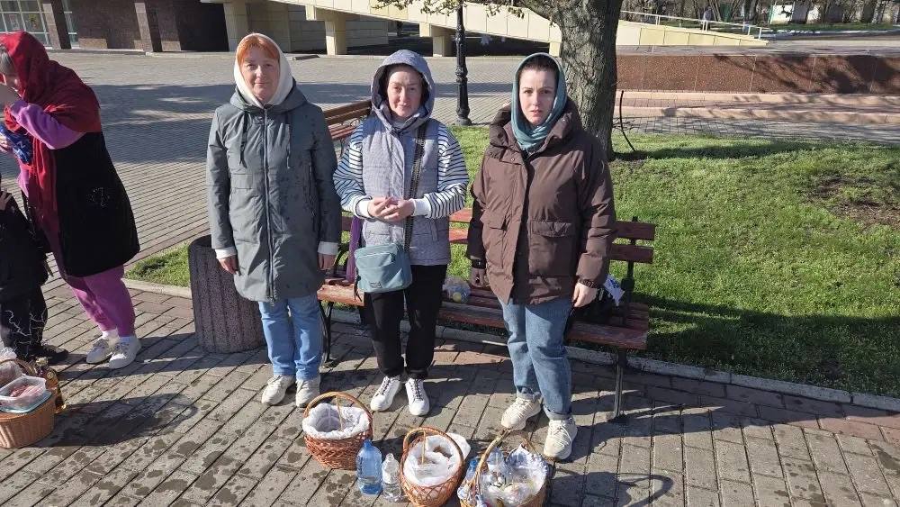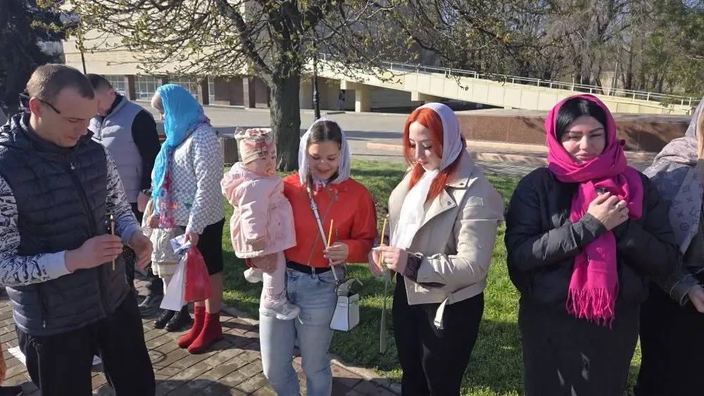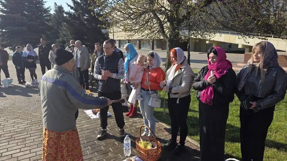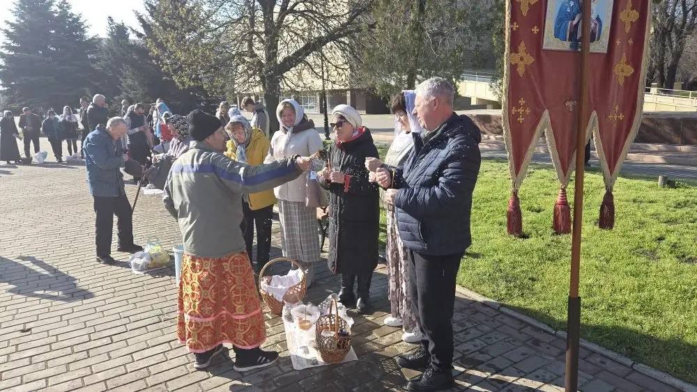 Также возле Храма в честь Воскресения Христова в городе Краснодоне пономарь Вячеслав провел обряд освящения куличей и пасхальных яств.