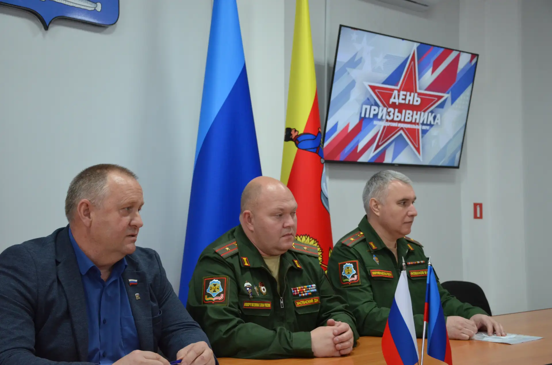 Сегодня в Новоайдарском округе состоялось мероприятие, посвященное Дню призывника. Председатель Совета округа Павел Гречишкин вместе с заместителем военного комиссара Денисом Застенским, начальником отделения Владимиром Фоминовым, благочинным протоиереем Евгением Рогозинским и представителями МЧС собрались вместе чтобы пообщаться с молодыми людьми, которые стоят на пороге службы в армии, а также с юнармейцами и активистами «Движения Первых».