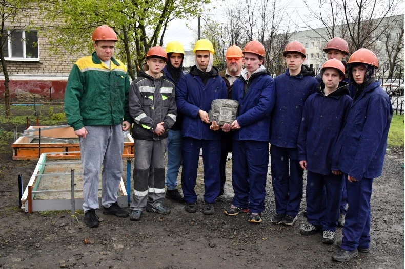 Вместе с первокурсниками группы 1ЖКХ, под руководством мастера производственного обучения Александра Маслова, Сергей Станиславович заложил первый камень в середине будущего фундамента под установку природного монолитного песчаника, завезённого с местного каменного карьера.