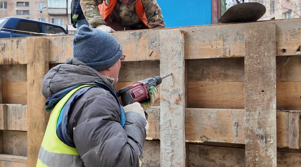 «Ранее у ЗАГСа находилась старая подпорная стена, сейчас ведётся монтаж новой конструкции. Устанавливаем опалубку, выполняем армирование, после чего будем заливать бетон. Планируем завершить работы уже на этой неделе — на данный момент готовность составляет около 80%, на объекте задействовано 25 человек».