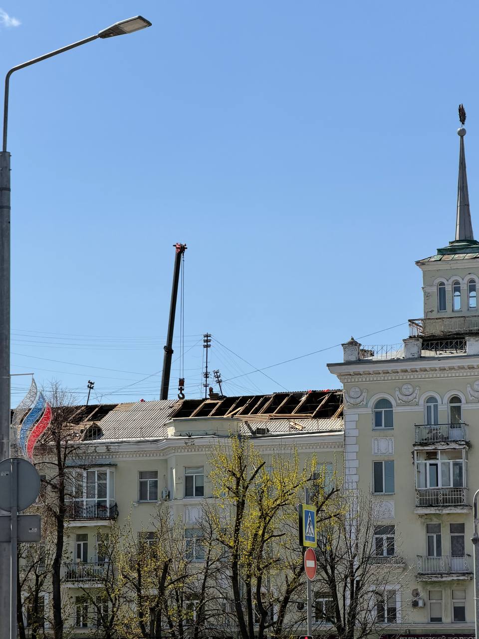 Работы идут полным ходом: специалисты частично сняли старую кровлю. Здание в центре — одна из архитектурных визитных карточек города.