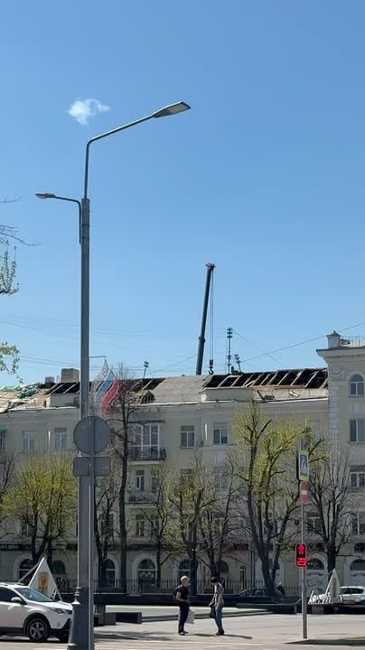 В Луганске ремонтируют крышу на доме со шпилем