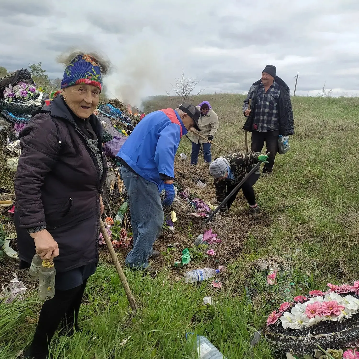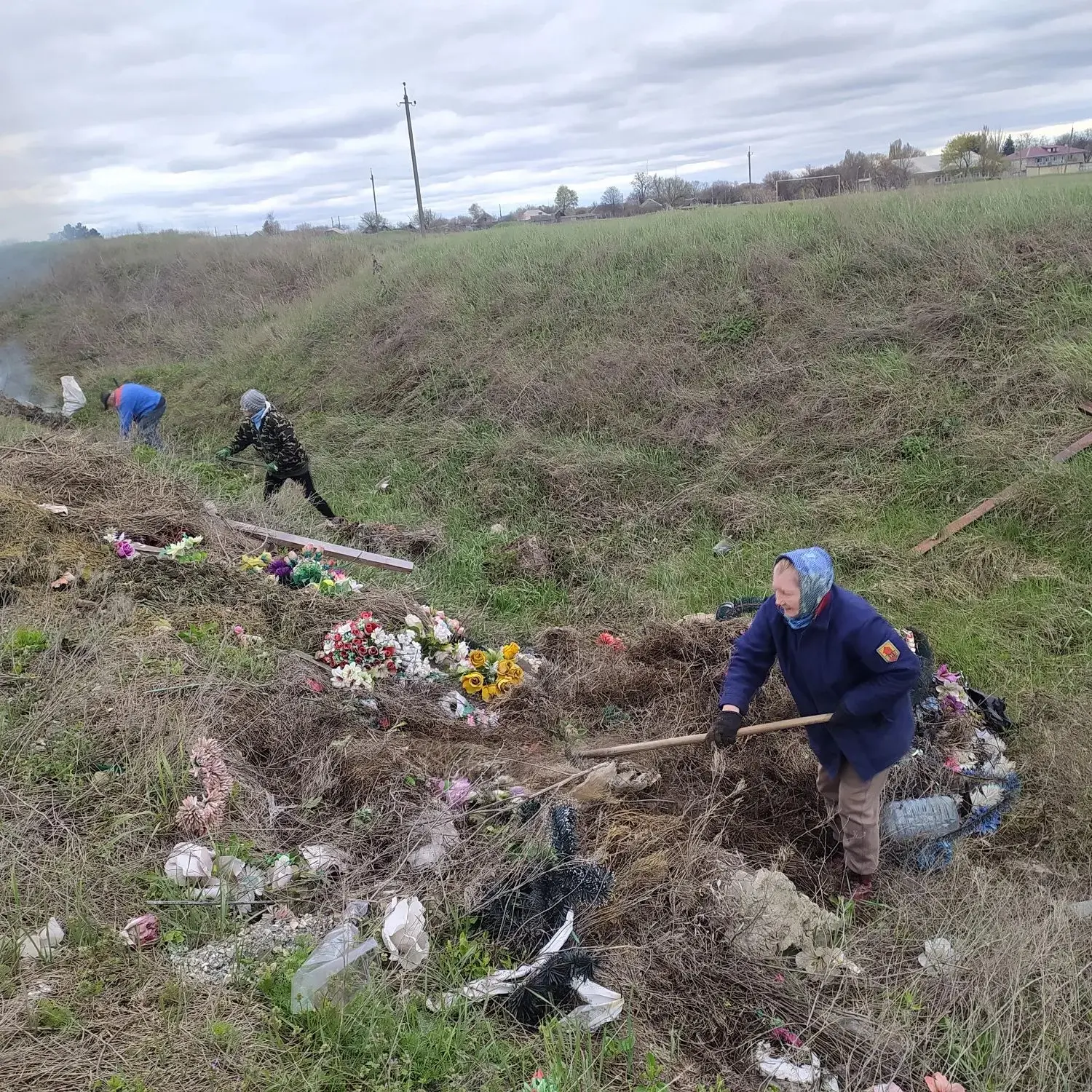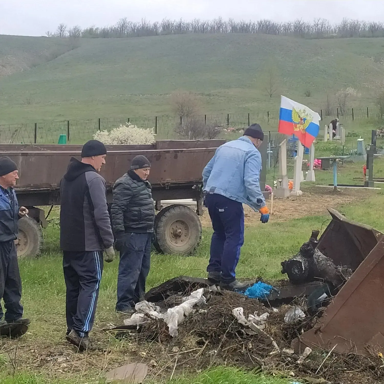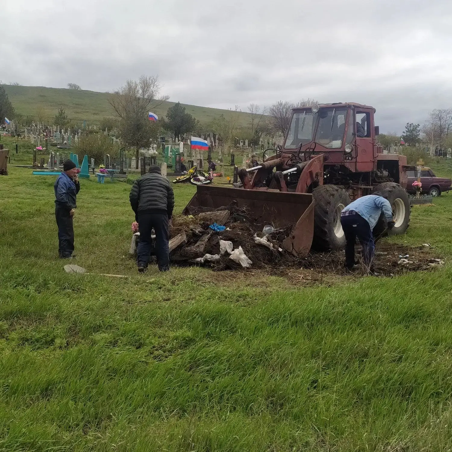 Силами местных жителей был убран сухостой, прошлогодняя опавшая листва, старые венки и цветы, старые выброшенные памятники, вывезен мусор, который местное население складировало по всему периметру кладбища. Всего было вывезено порядка 48 тонн мусора.