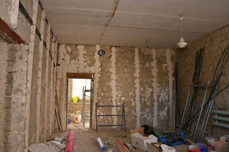 Сейчас в помещении трудно узнать старый спортивный зал. Первый и самый трудоемкий этап — демонтаж — полностью завершен. Здание освободили от старых конструкций не только в центральном помещении, но и в прилегающих раздевалках, а также в тренерской.