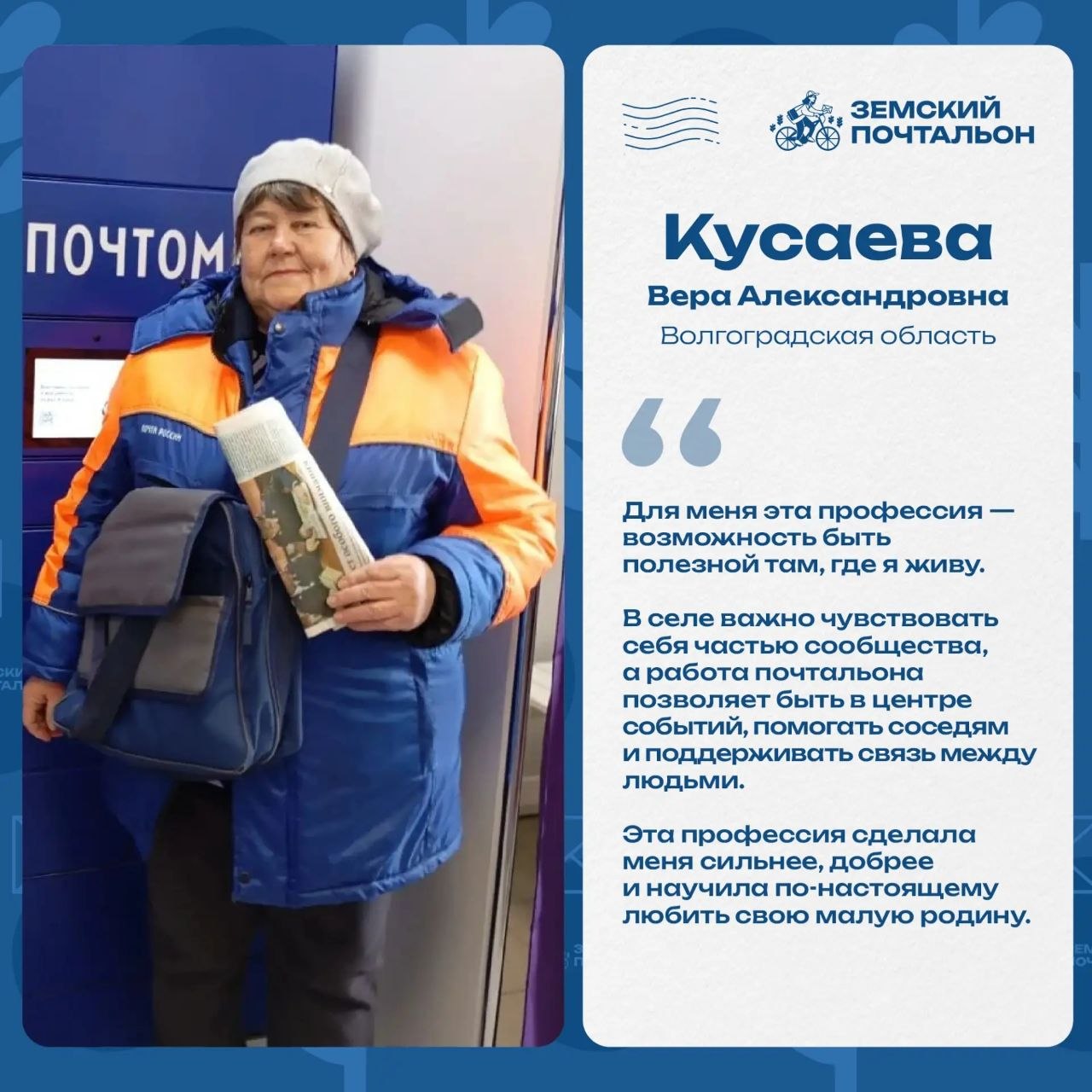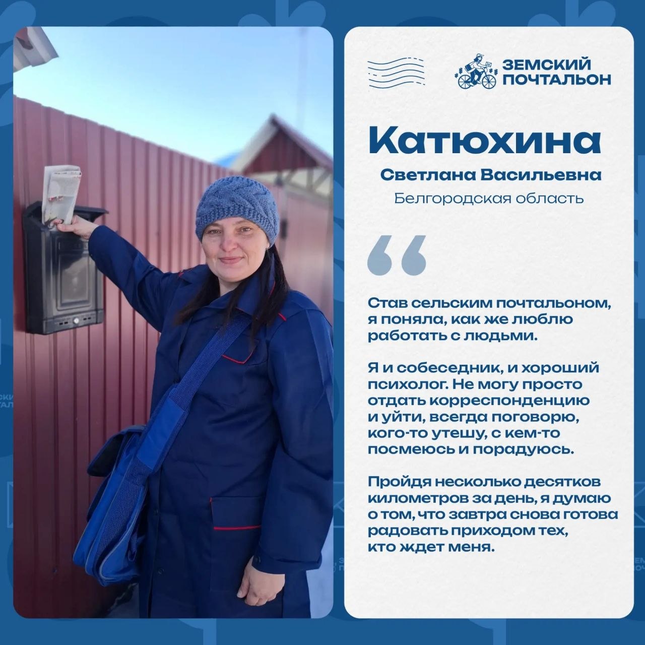 Каждая история — это не просто рассказ о профессии, а о людях, которые искренне любят своё дело, ценят общение с жителями и ежедневно помогают своим землякам. Для многих почтальонов это не просто работа, а возможность быть рядом, поддерживать и приносить пользу своим населённым пунктам.