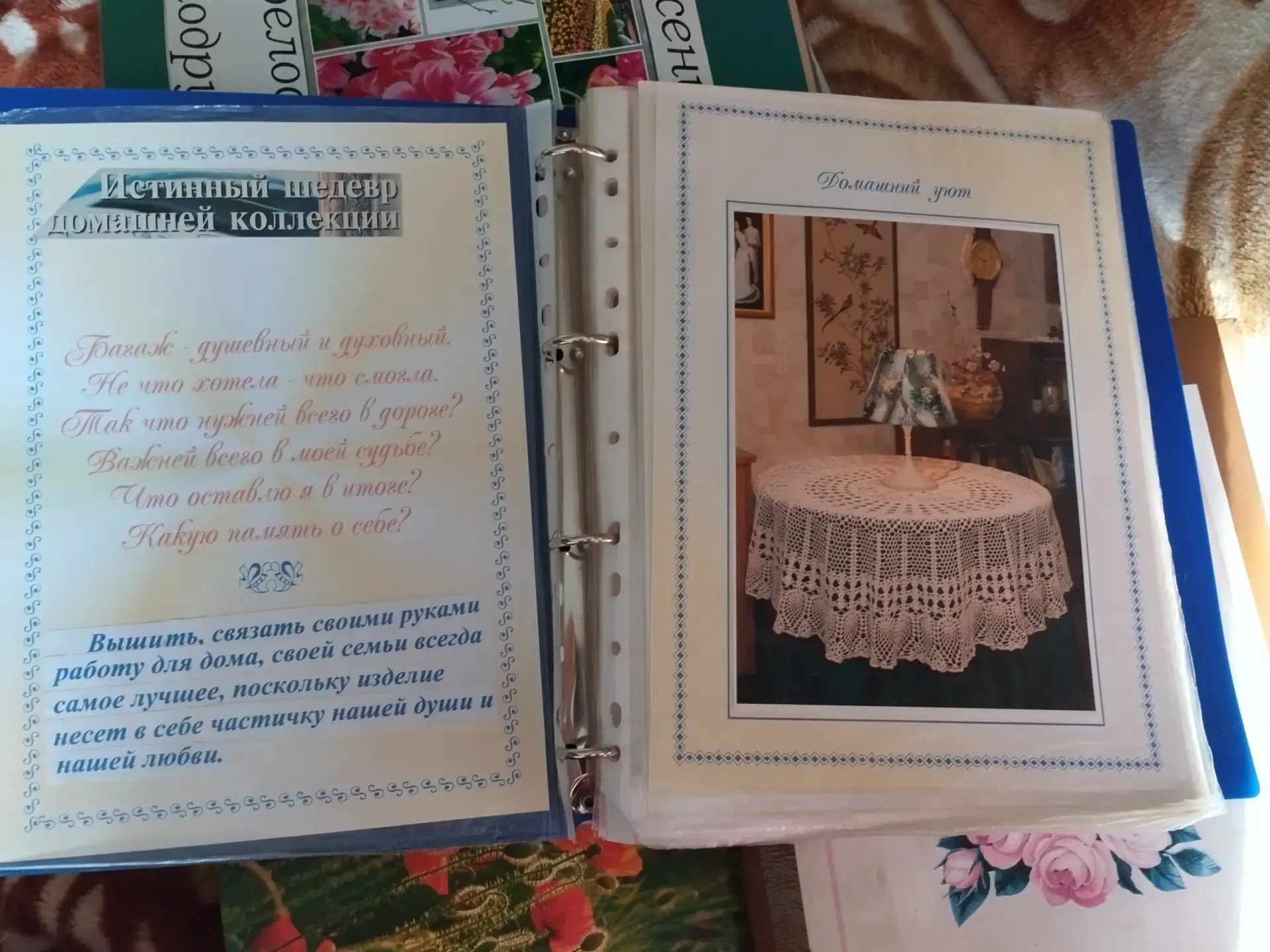 Главное место в сердце Лидии Алексеевны занимают её близкие: сын, невестка, внуки, правнучка. «Счастлив тот, кто дожил до правнуков», — говорит она и улыбается. Мир её увлечений — это чтение, поэзия, вышивка крестом и гладью, вязание крючком и на спицах, плетение макраме. И всё это для уюта дома и семьи. Её талант многогранен. Вышитые гладью и бисером работы требуют философского осмысления, а от вязаных изделий невозможно оторвать глаз!