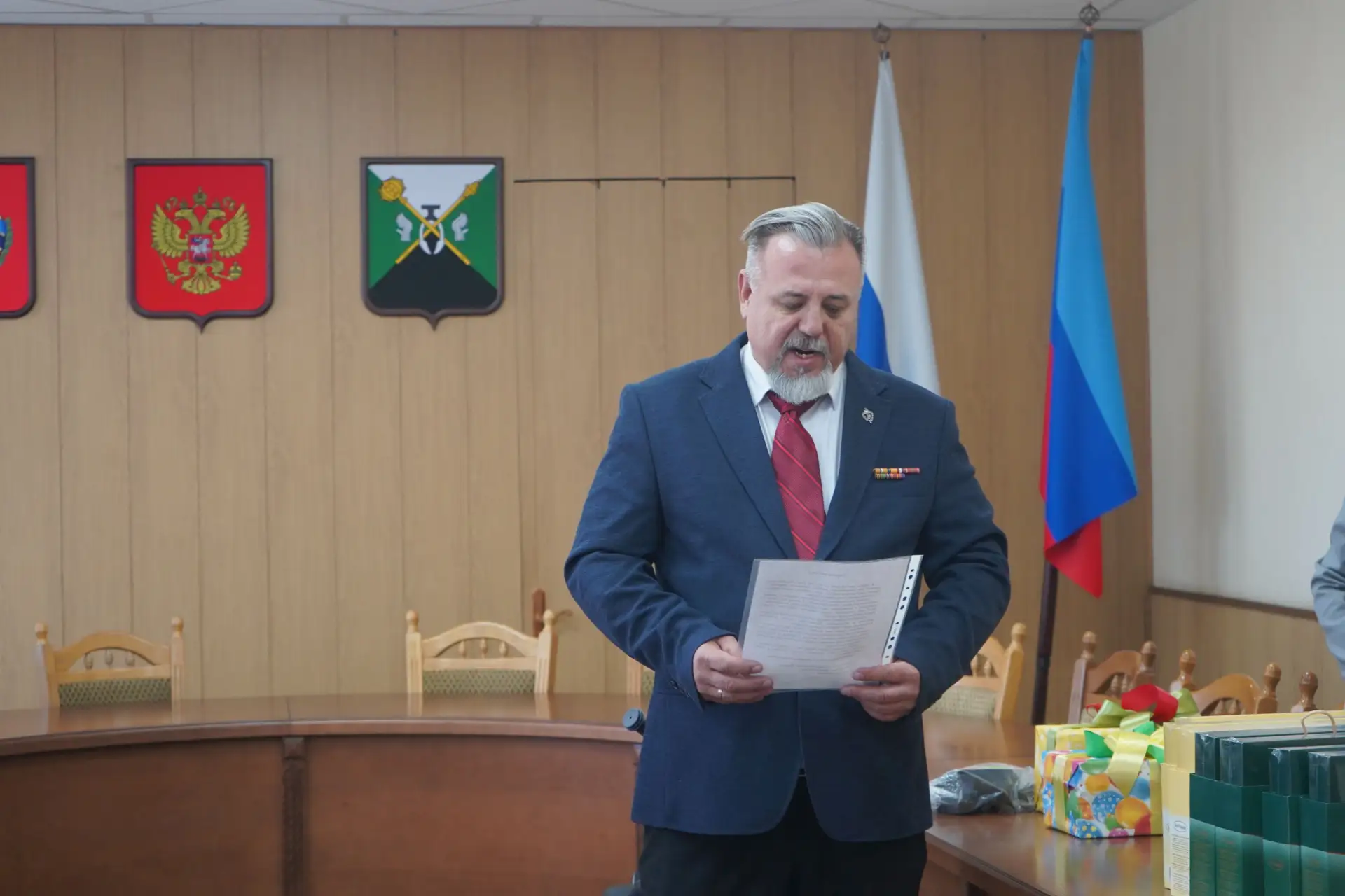 В торжественной обстановке заместитель Главы Администрации Свердловского муниципального округа Татьяна Мирошникова и представитель правительства Хакасии в новых регионах России Леонид Лапин передали юным жителям округа сюрпризы.