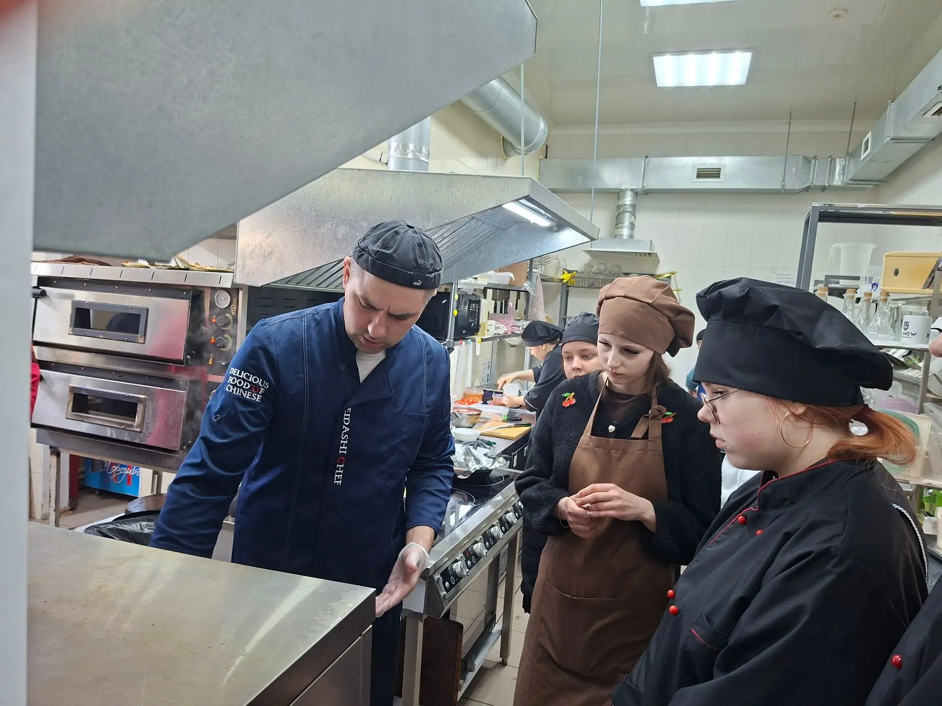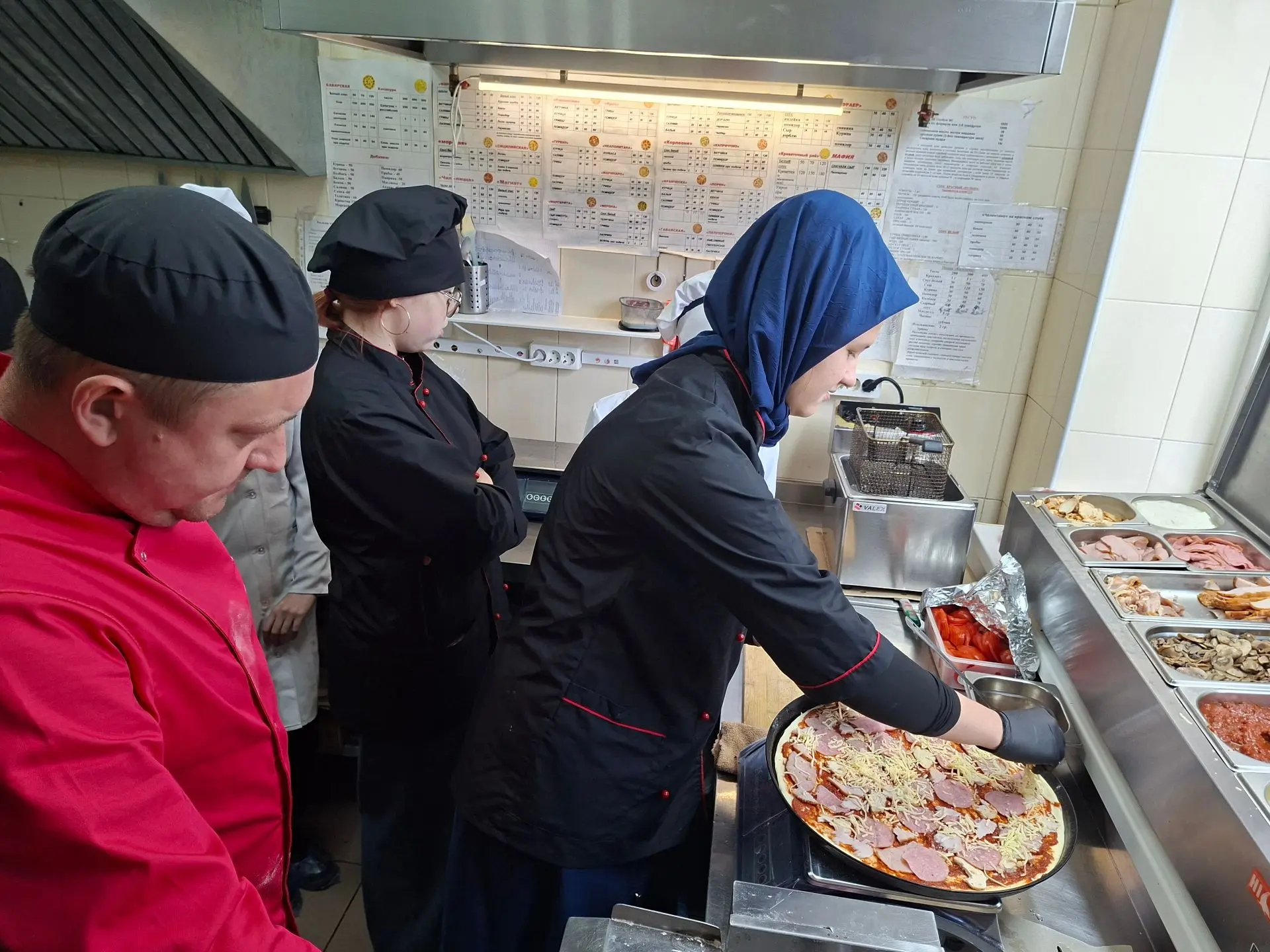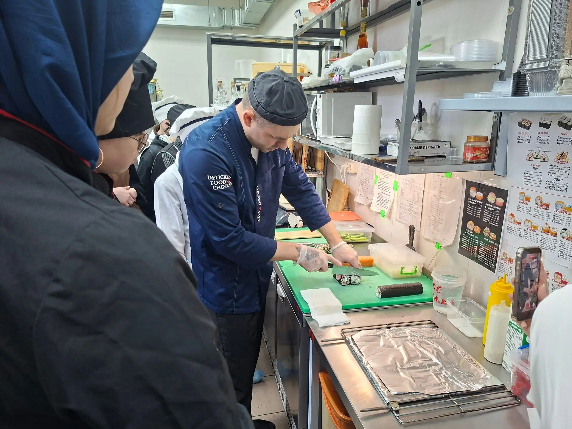 Будущие повара посетили горячий цех, увидели морозильные камеры и холодильники с заготовками. Большой интерес вызвало приготовление пиццы и суши. Во время мастер-класса под руководством пиццайоло студентки смазывали тесто соусом, раскладывали начинку и посыпали сыром. Все ингредиенты, согласно рецептуре, были строго обозначены. Отправив пиццу в духовку, будущие повара познакомились с приготовлением суши. При соблюдении технологии приготовления и правильного хранения продуктов, получается блюдо, которое пользуется большой популярностью среди посетителей кафе и жителей города.