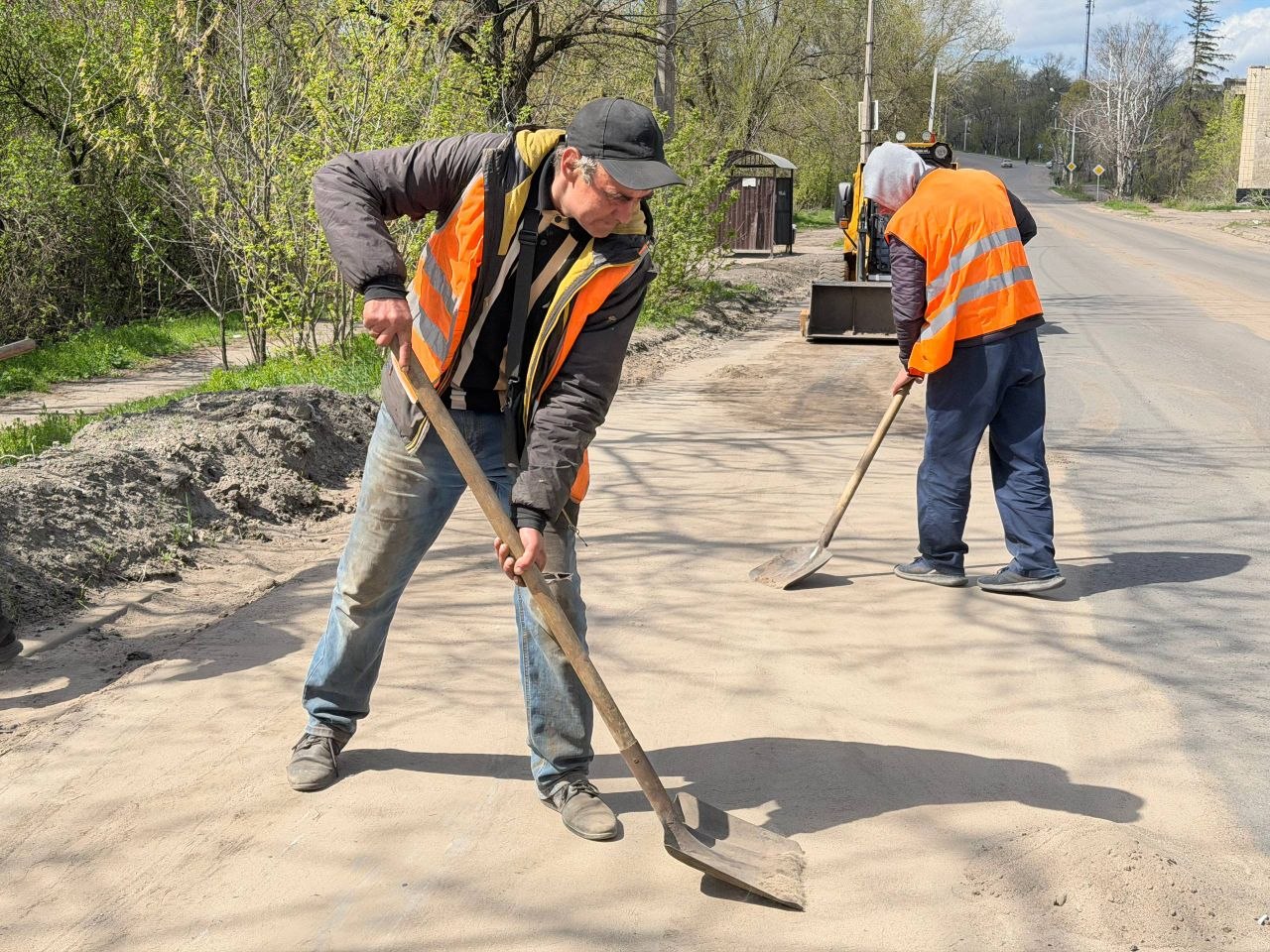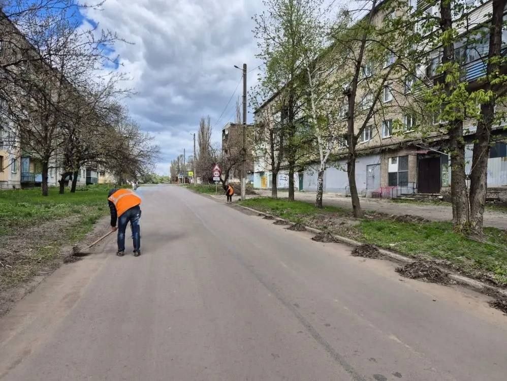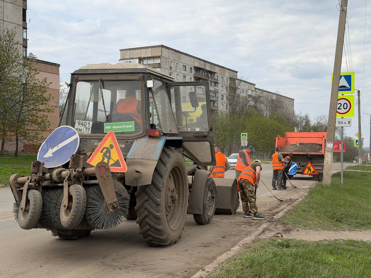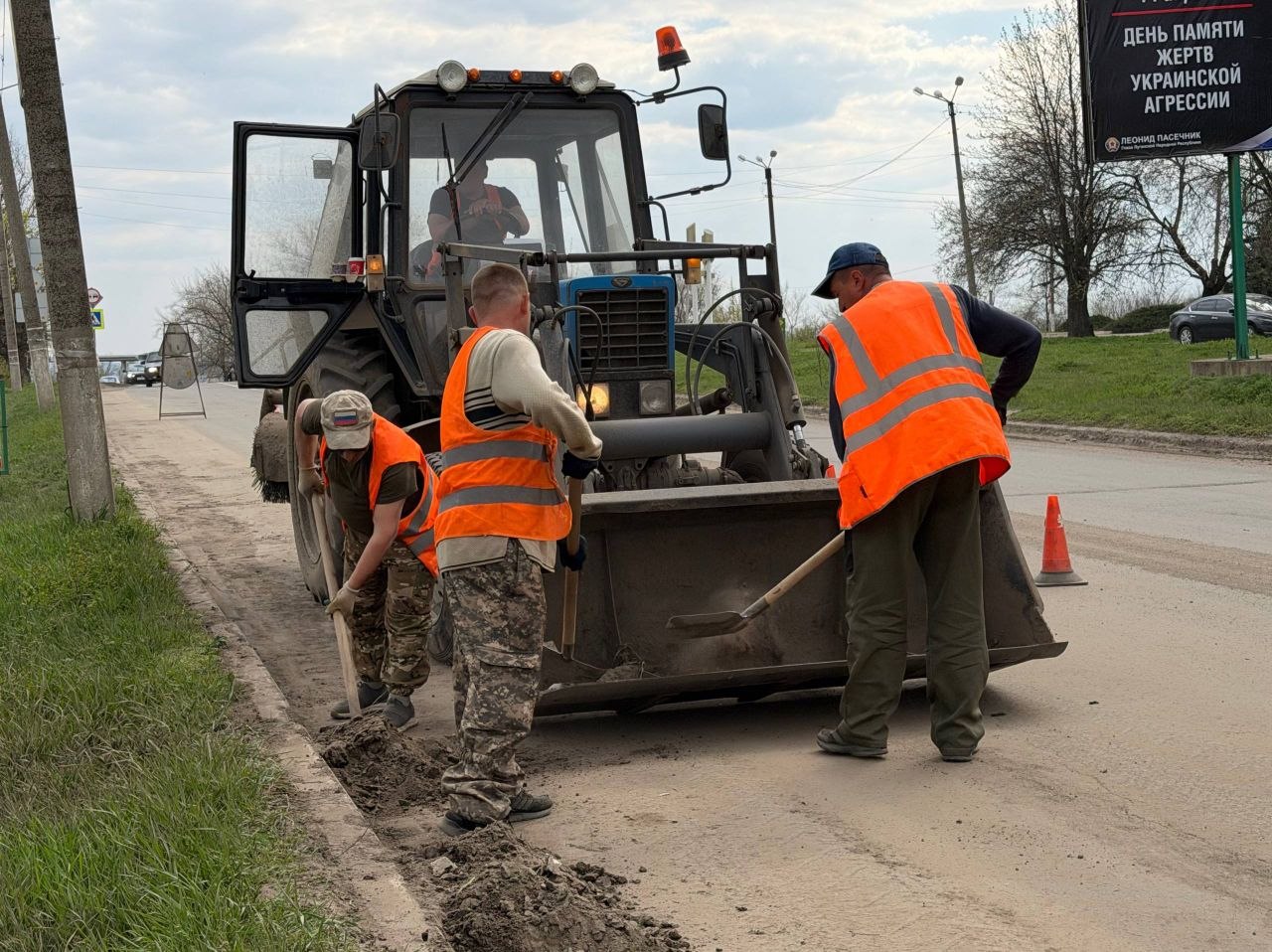 На улице Ленина ведется уборка уплотненного грунта вдоль бордюрного камня, для чего задействованы как механизированные средства, так и ручной труд.