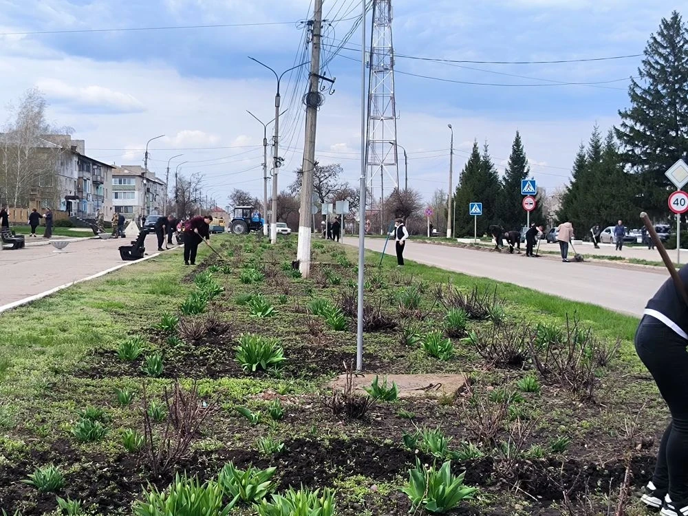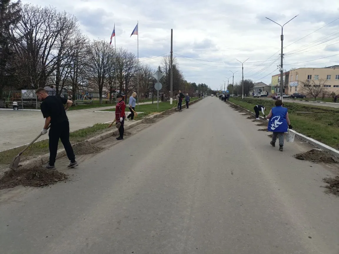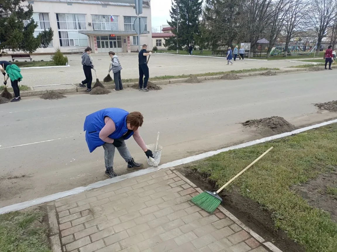 проспекту Победы. Участники тщательно очистили обочины от накопившегося за зимний период песка и грязи и побелили бордюры, что придало центру поселка свежий и ухоженный облик.