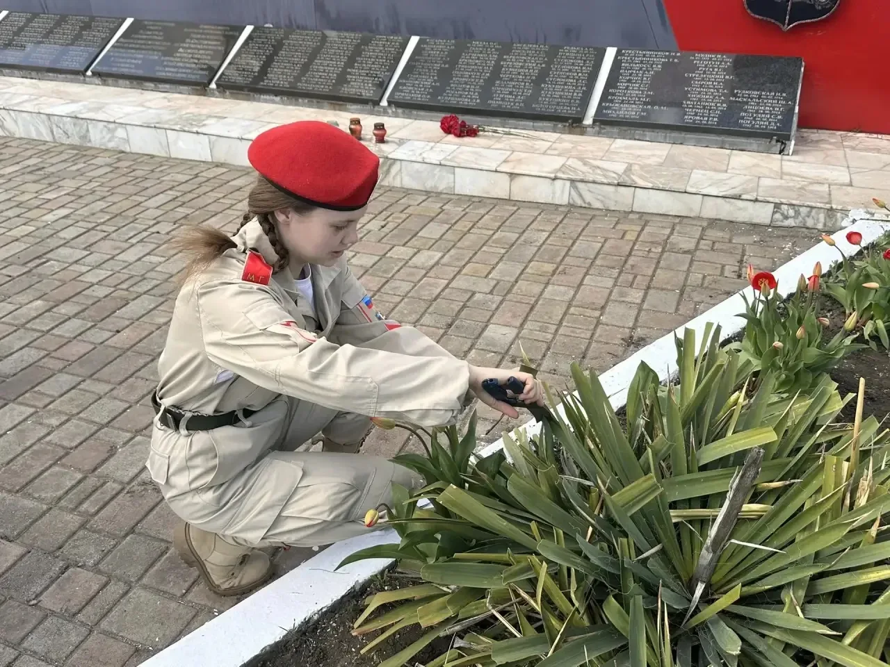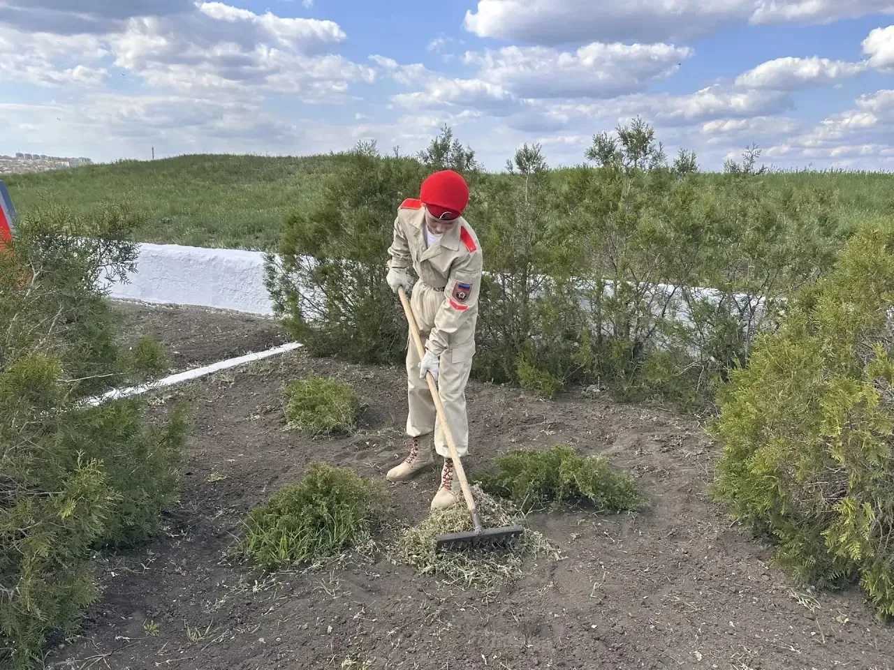 Ребята привели в порядок прилегающую территорию: очистили клумбы от сухой листвы и мусора, пропололи растения, а также полили молодые сосны, высаженные у мемориала. Все работы выполнены с заботой и уважением к памяти защитников.