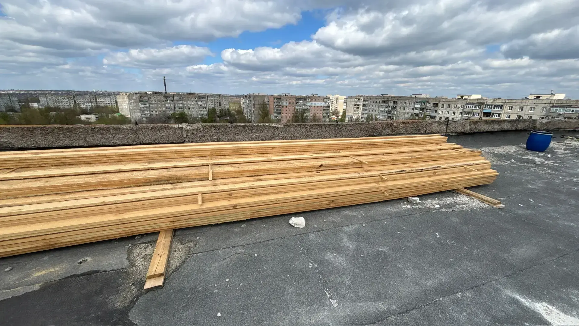 В настоящее время бригада занята устройством ходовых мостков — они необходимы для безопасного и удобного доступа к разным участкам крыши. Следующий этап — демонтаж старой кровли.