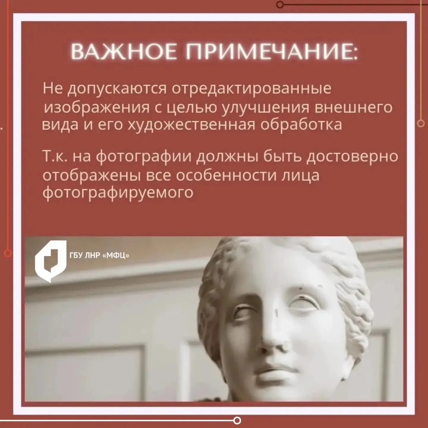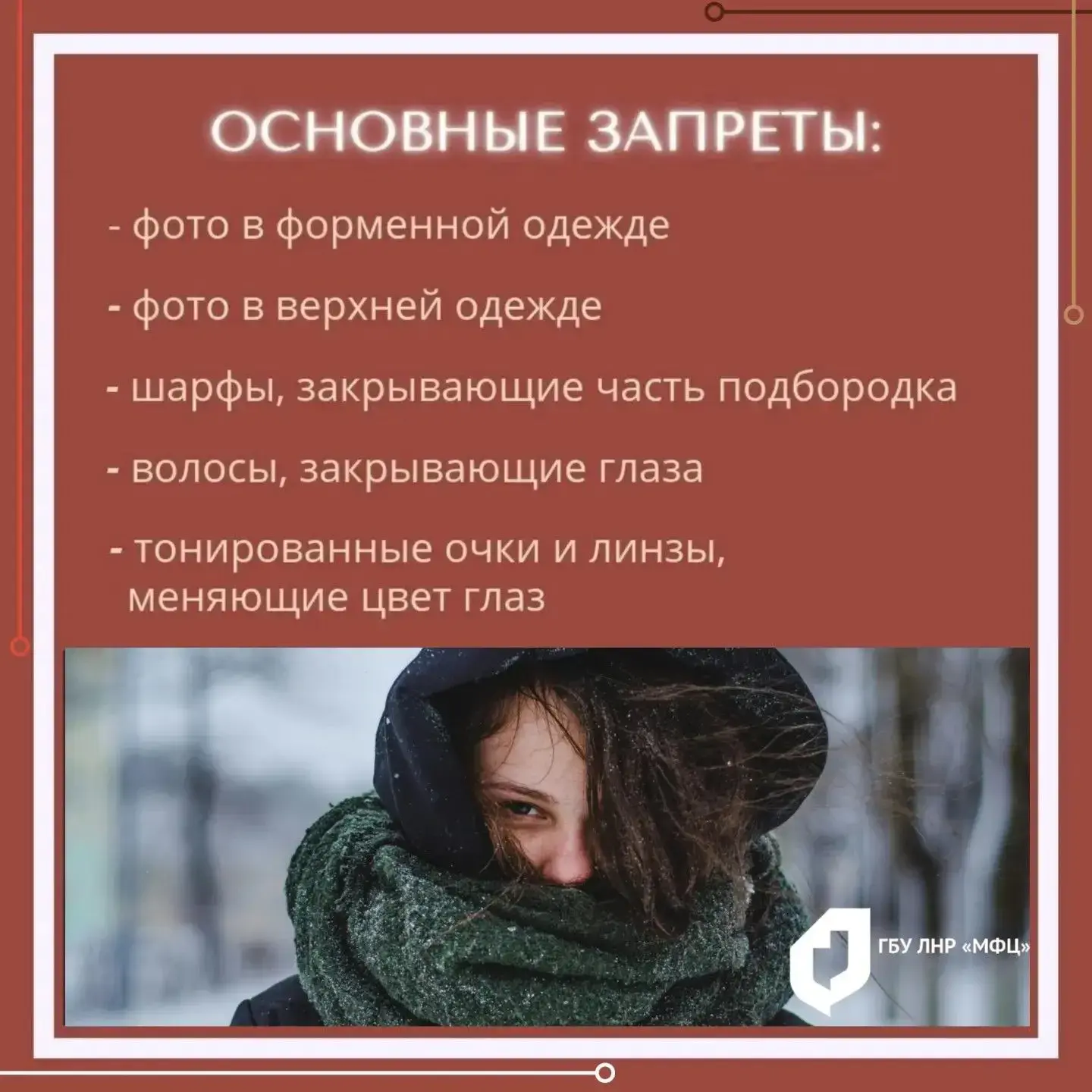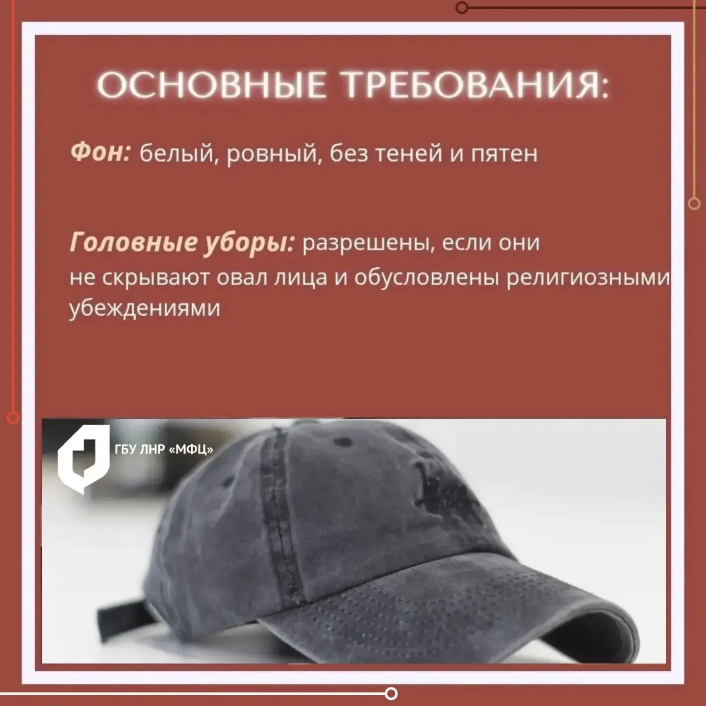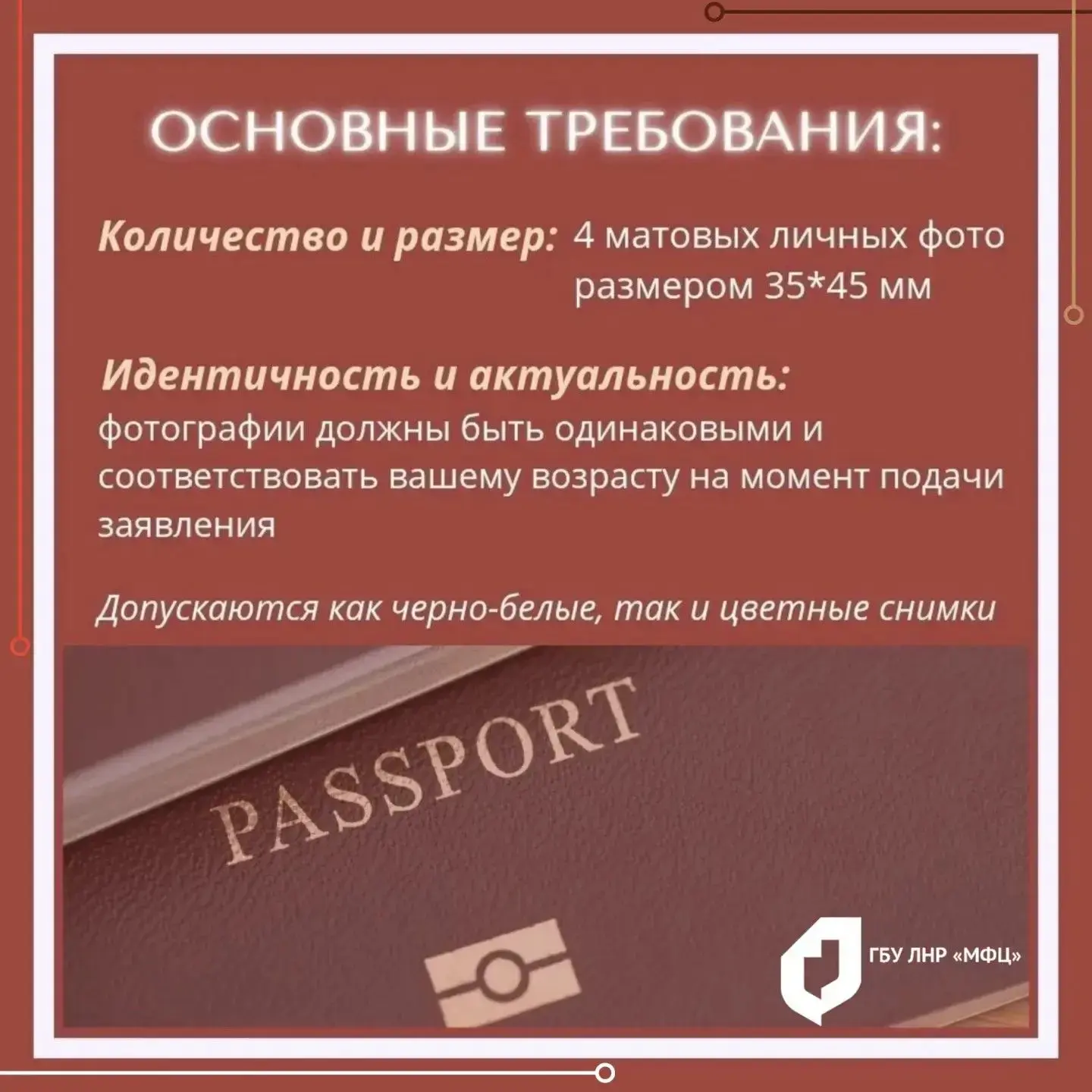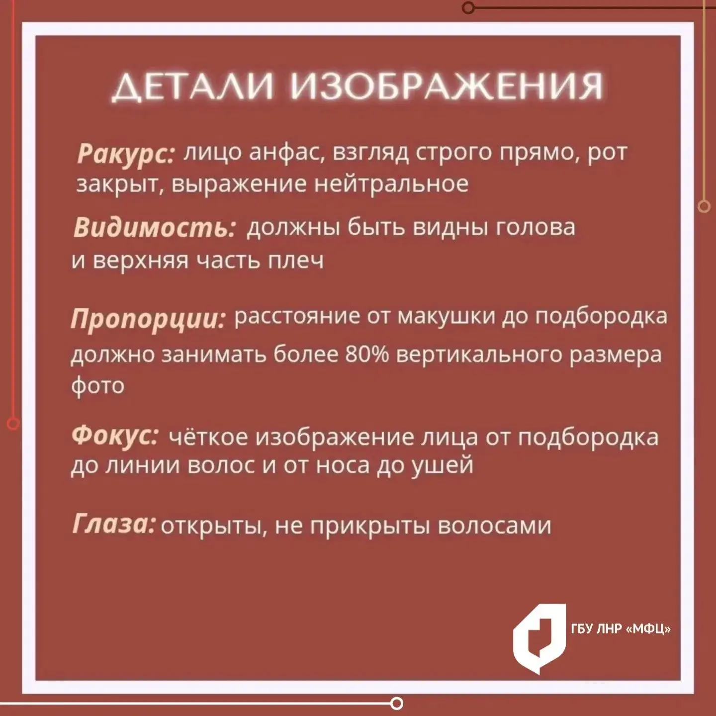 Чтобы при подаче документов через МФЦ ЛНР не возникло проблем с фото, в МФЦ ЛНР подготовили карточки с главными требованиями к снимку.