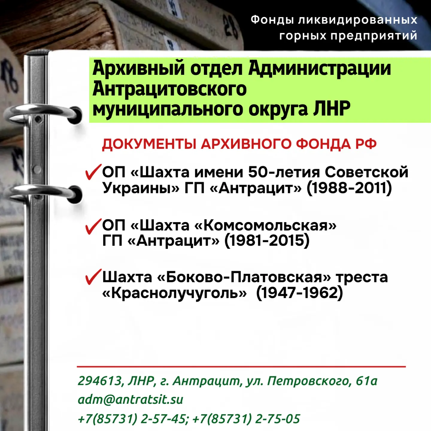 Перед подачей запроса рекомендуем ознакомиться со списком шахт, документы которых находятся на хранении в архивных учреждениях республики. В наших карточках указаны названия горных предприятий, периоды, за которые хранятся документы, а также контакты муниципального архива.