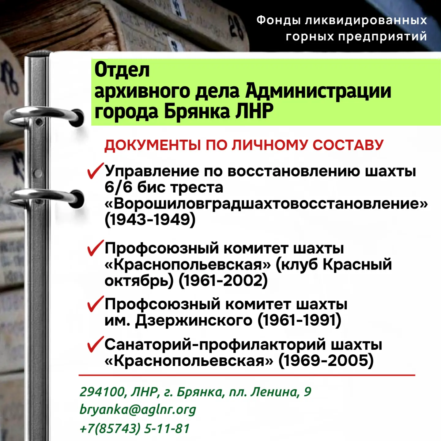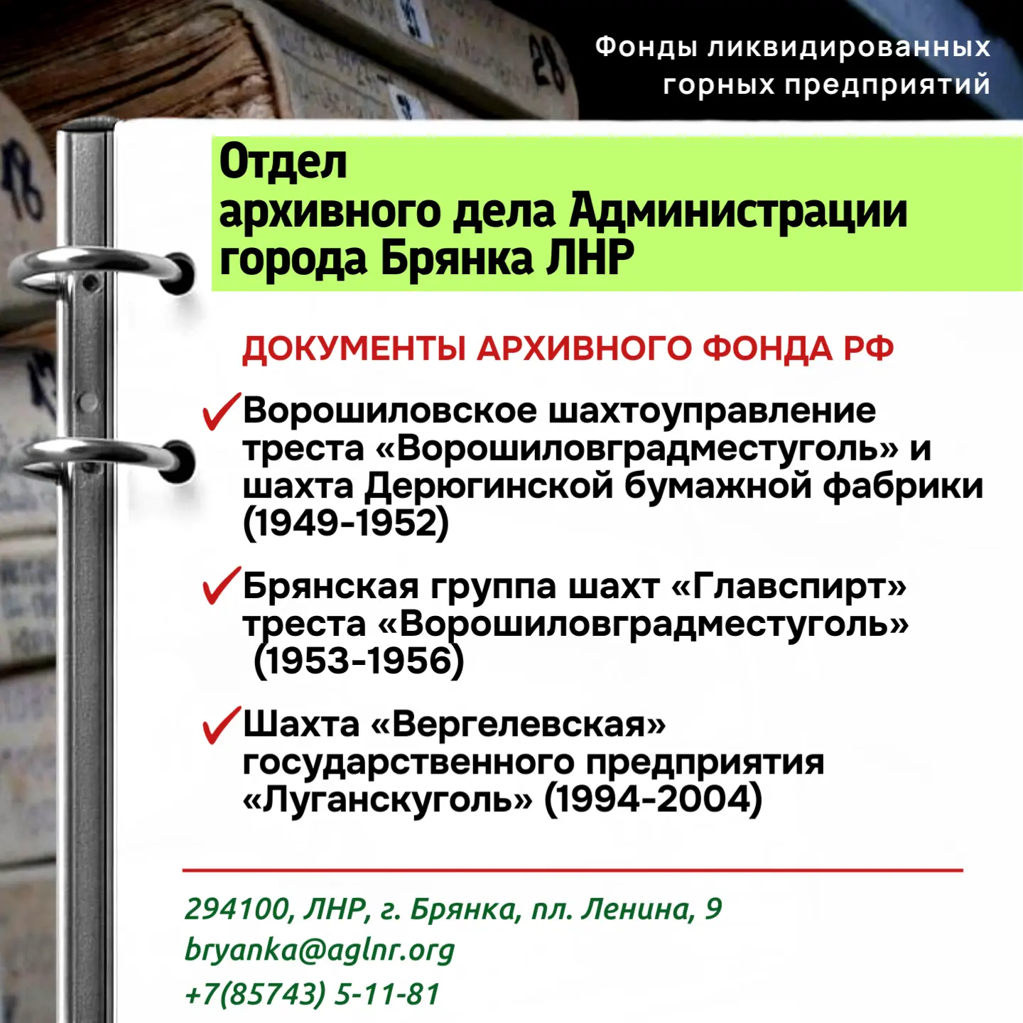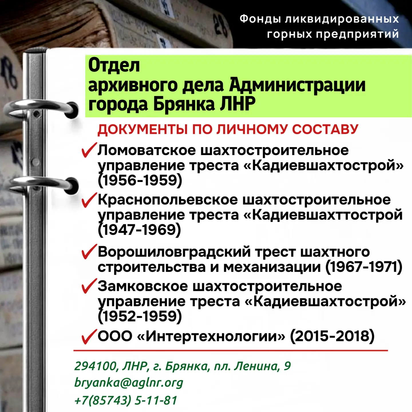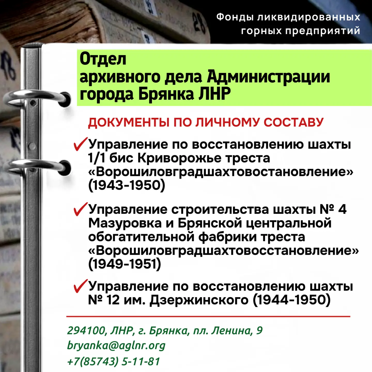 Ознакомиться с полным перечнем шахт, передавших документы на хранение, можно на сайте Архивной службы ЛНР в разделе фонды ликвидированных горных предприятий или перейдя по ссылке: https://arch.lpr-reg.ru/fondlikvid.html