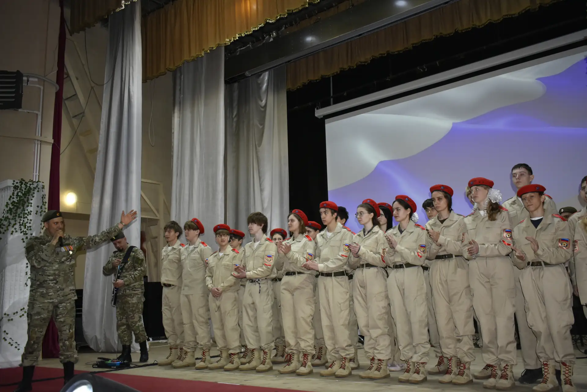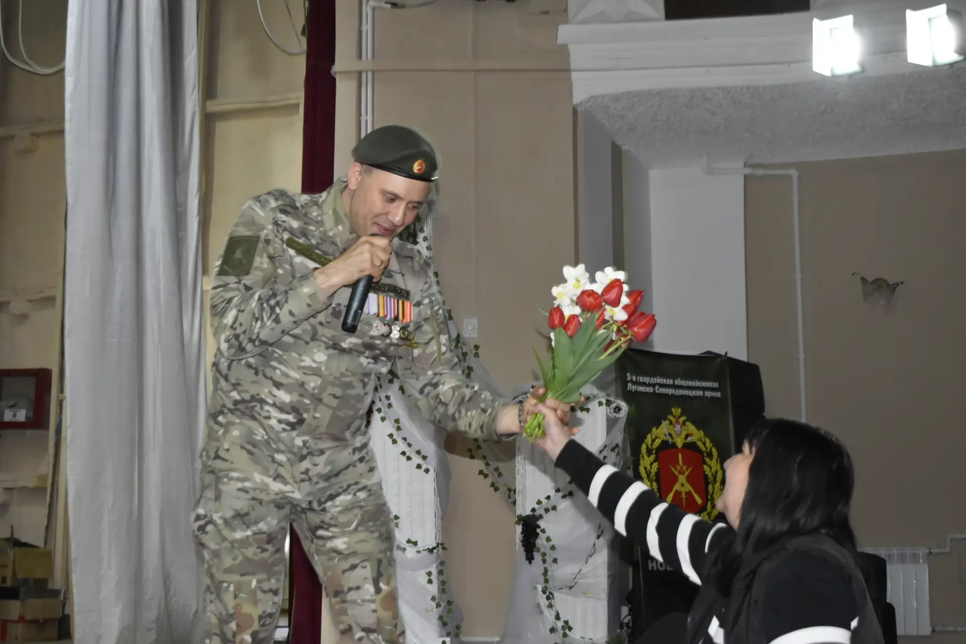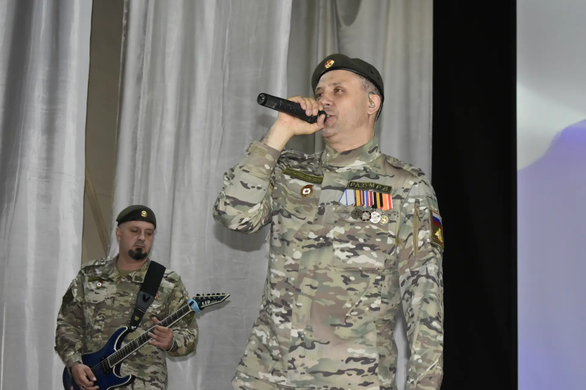 Большим подарком для собравшихся в зале стало выступление военного ансамбля «Новороссия». Солист ансамбля Роман Разум – офицер, поэт, композитор, заслуженный артист ЛНР. На протяжении 10 лет его творческий коллектив поддерживает боевой дух защитников Родины, регулярно посещая боевые позиции, выступает с концертами в различных регионах России.