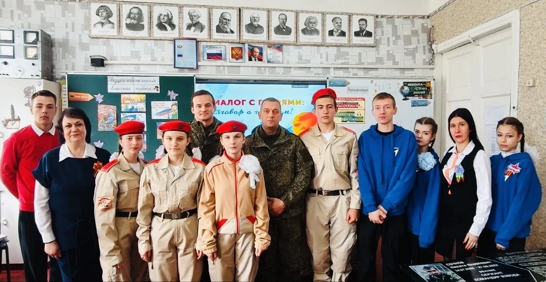 Сегодня в стенах ССШ №1 Алмазной прошла особенная встреча, ставшая частью масштабного Всероссийского проекта «Диалоги с Героями». Для наших школьников это был не просто урок, а живой разговор с настоящими героями нашего времени — действующими военнослужащими 26-го мотострелкового полка 70-й мотострелковой дивизии.