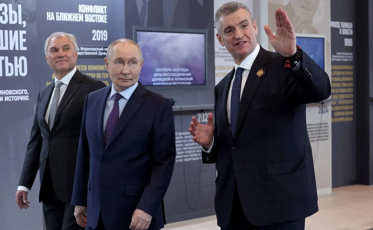 Экспозицию главе государства представил Председатель ЛДПР Леонид Слуцкий. Вместе с Президентом выставку осмотрел и Председатель Государственной Думы Вячеслав Володин.