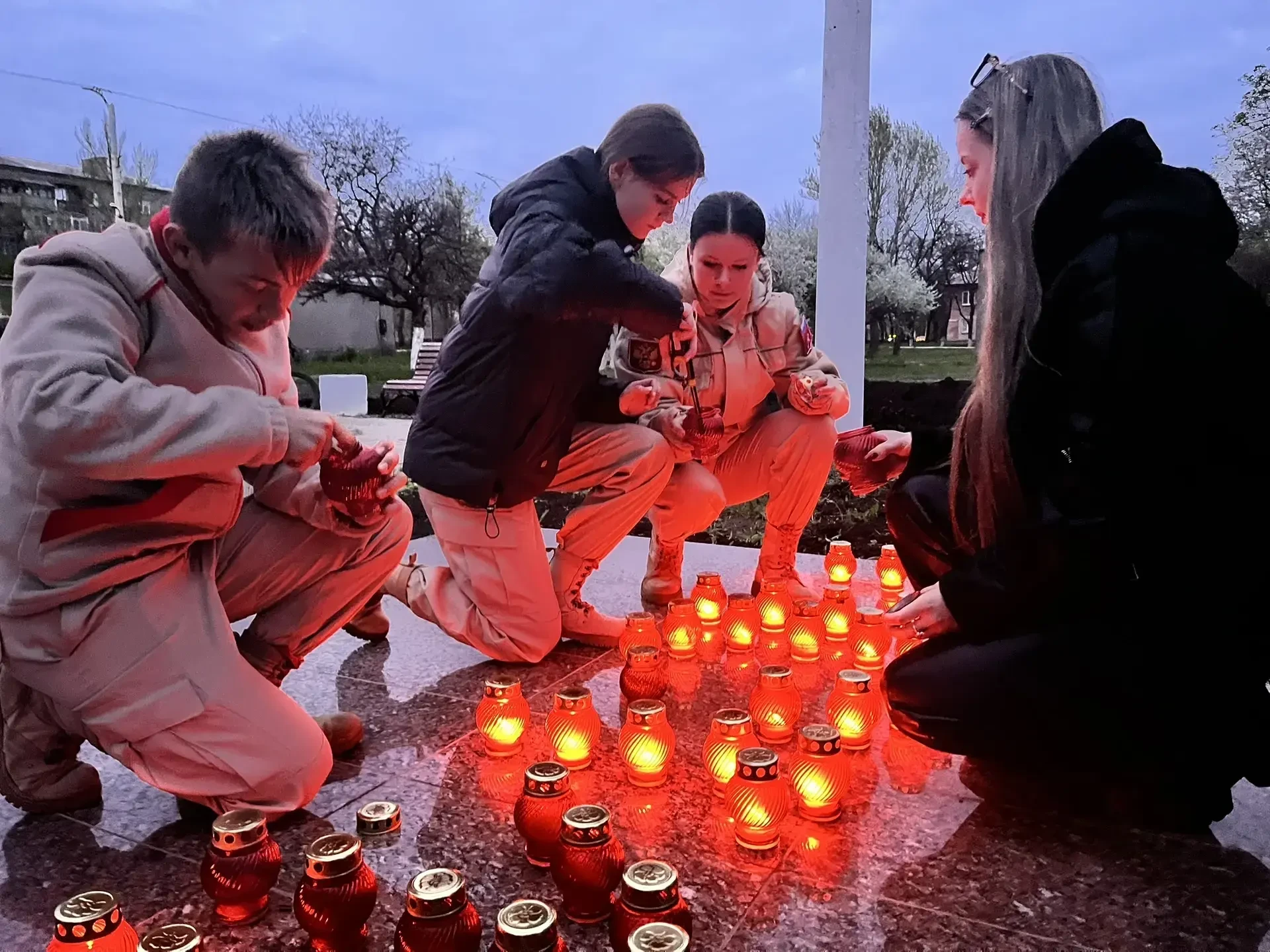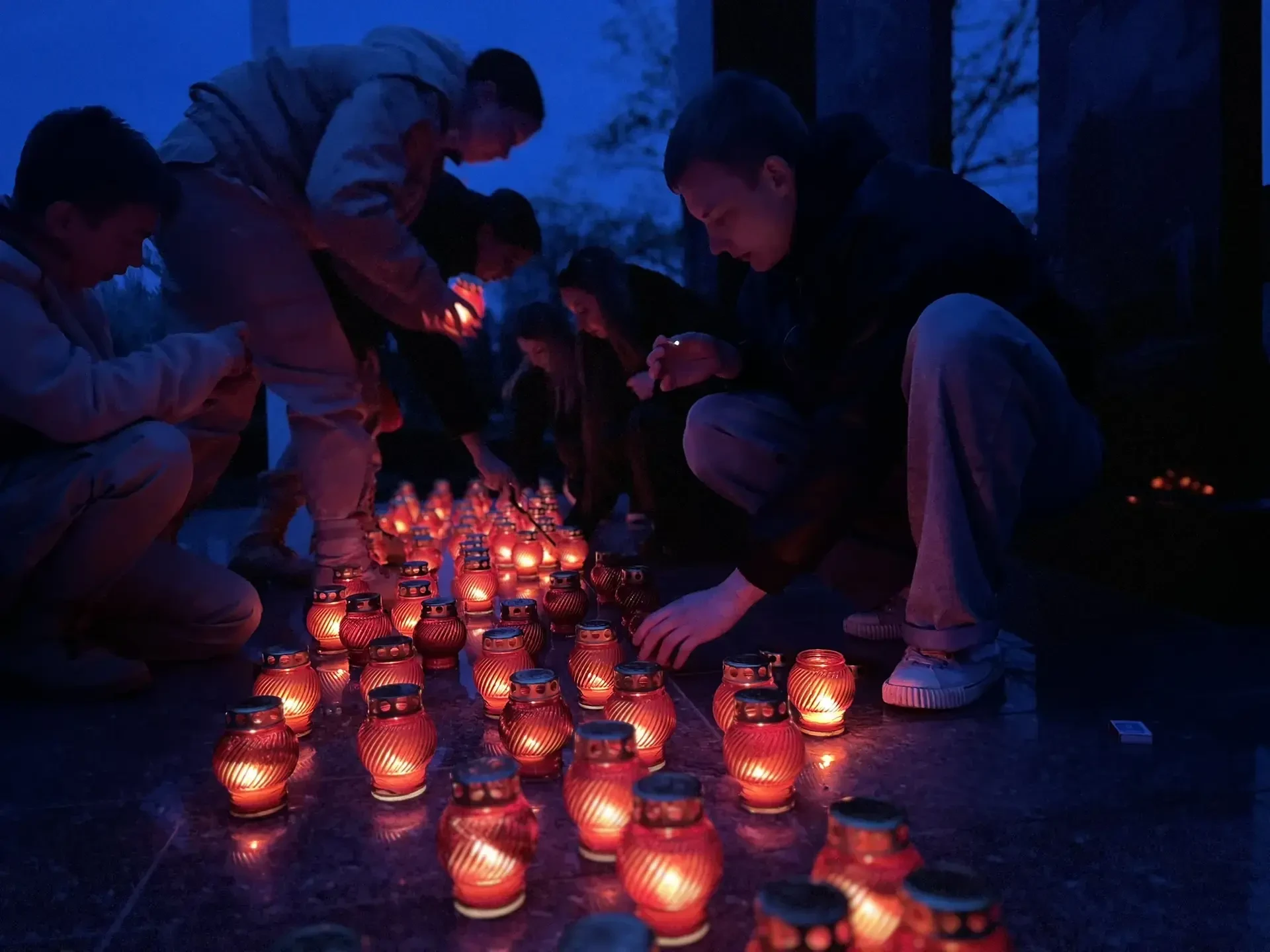Молодые ребята у мемориала выложили из свечей слово «ПОМНИМ». Завершилось все минутой молчания и экскурсией в музее.