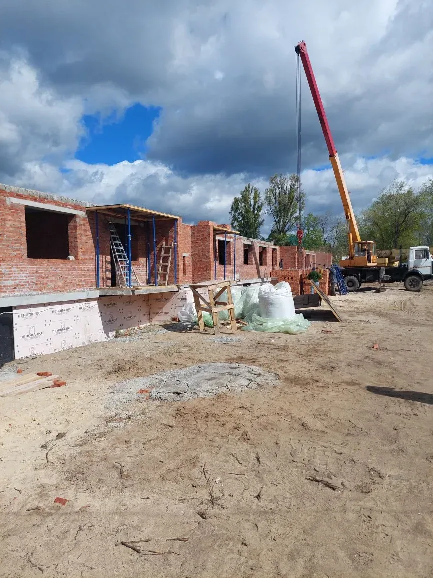 На объекте сейчас активно ведутся работы по монтажу железобетонных плит перекрытия первого этажа, кладке внутренних перегородок из кирпича, заделке межплиточных швов, изготовлению опалубки для армирующего пояса и другим технологическим процессам. Работы идут по графику, подрядчик соблюдает все требования к организации строительного процесса.