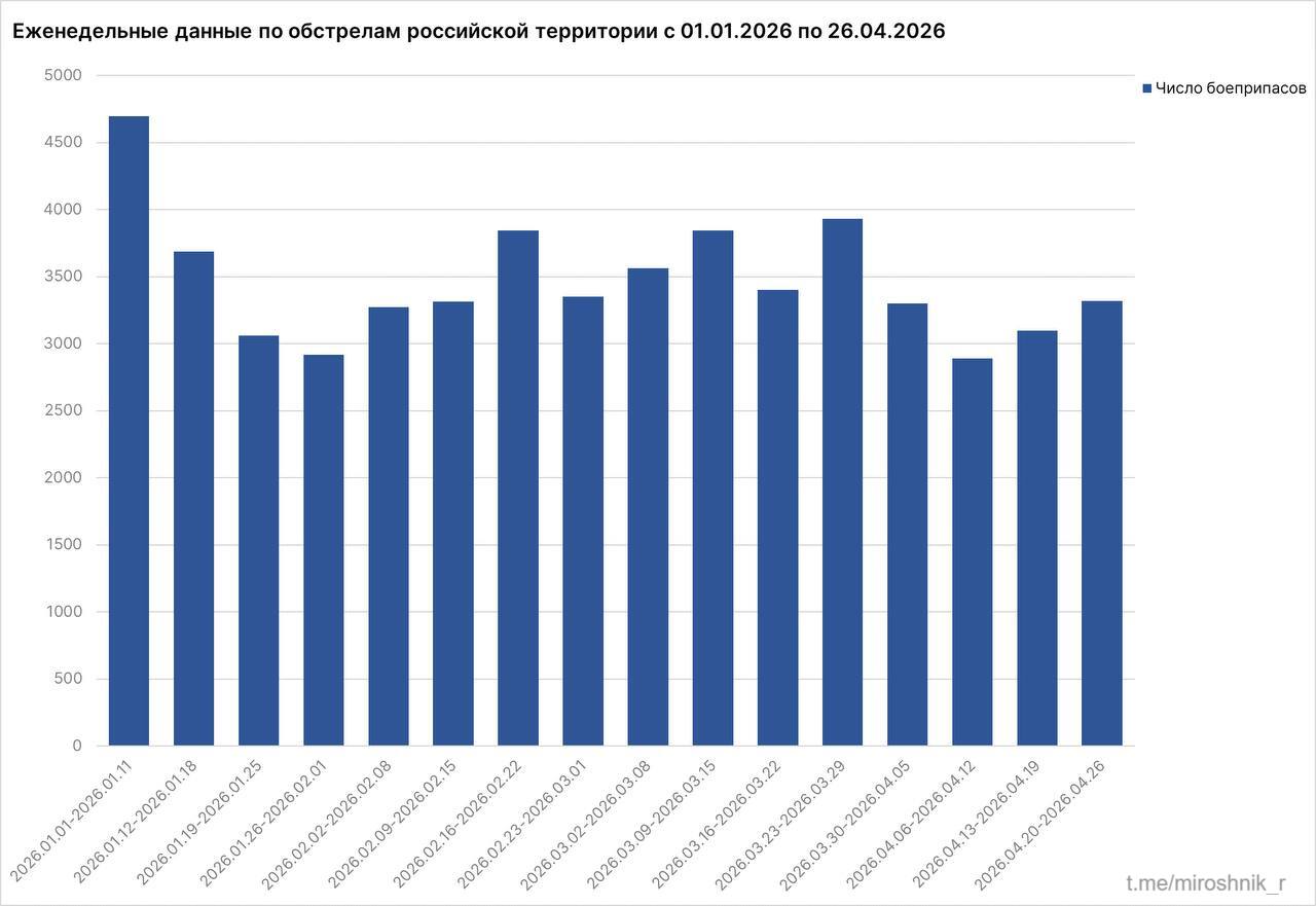 Всего по гражданским объектам на территории РФ за прошедшие семь дней украинские военные выпустили не менее 3 318 боеприпасов.