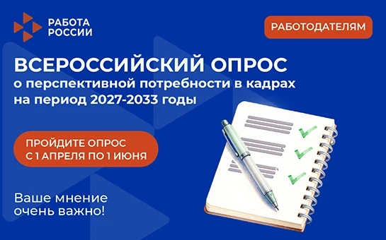 С 1 апреля по 1 июня 2026 года проводится Всероссийский опрос работодателей о перспективной кадровой потребности на 2027–2033 годы. По результатам опроса формируется кадровая политика РФ.