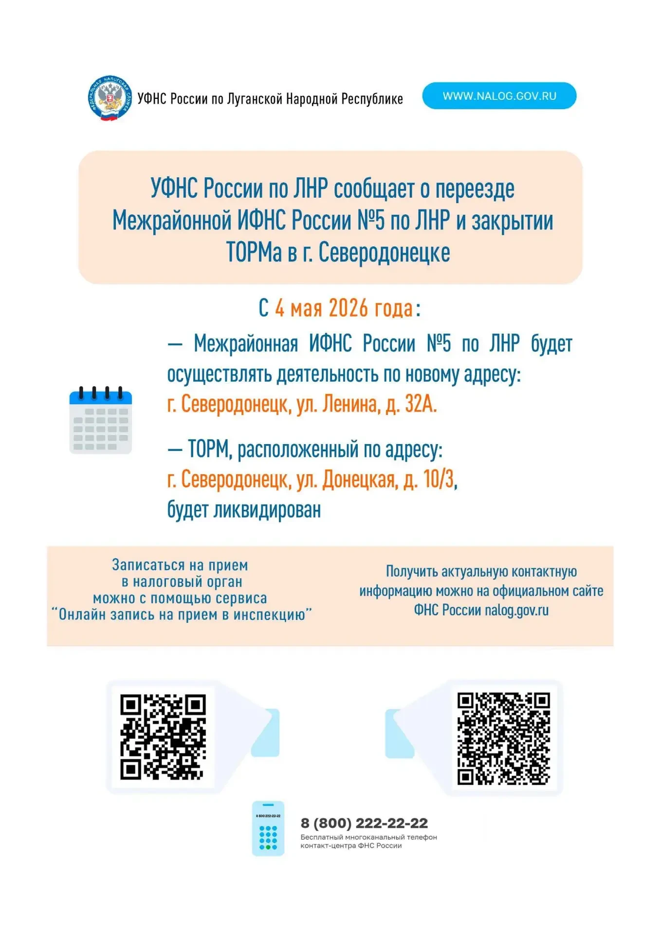 С 4 мая 2026 года территориально-обособленное рабочее место Межрайонной ИФНС России №5 по Луганской Народной Республике, осуществляющее деятельность по адресу: