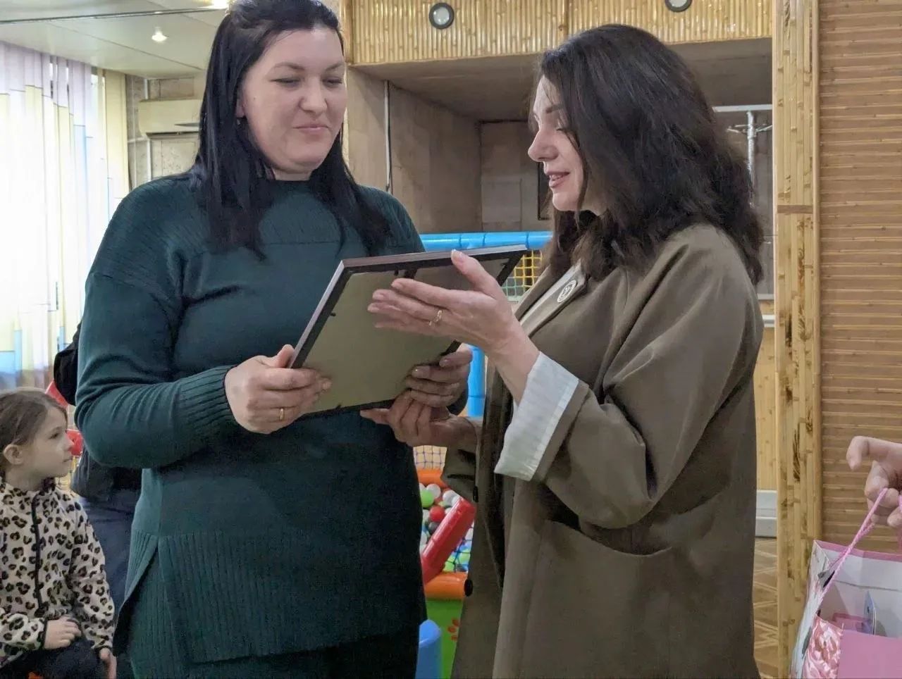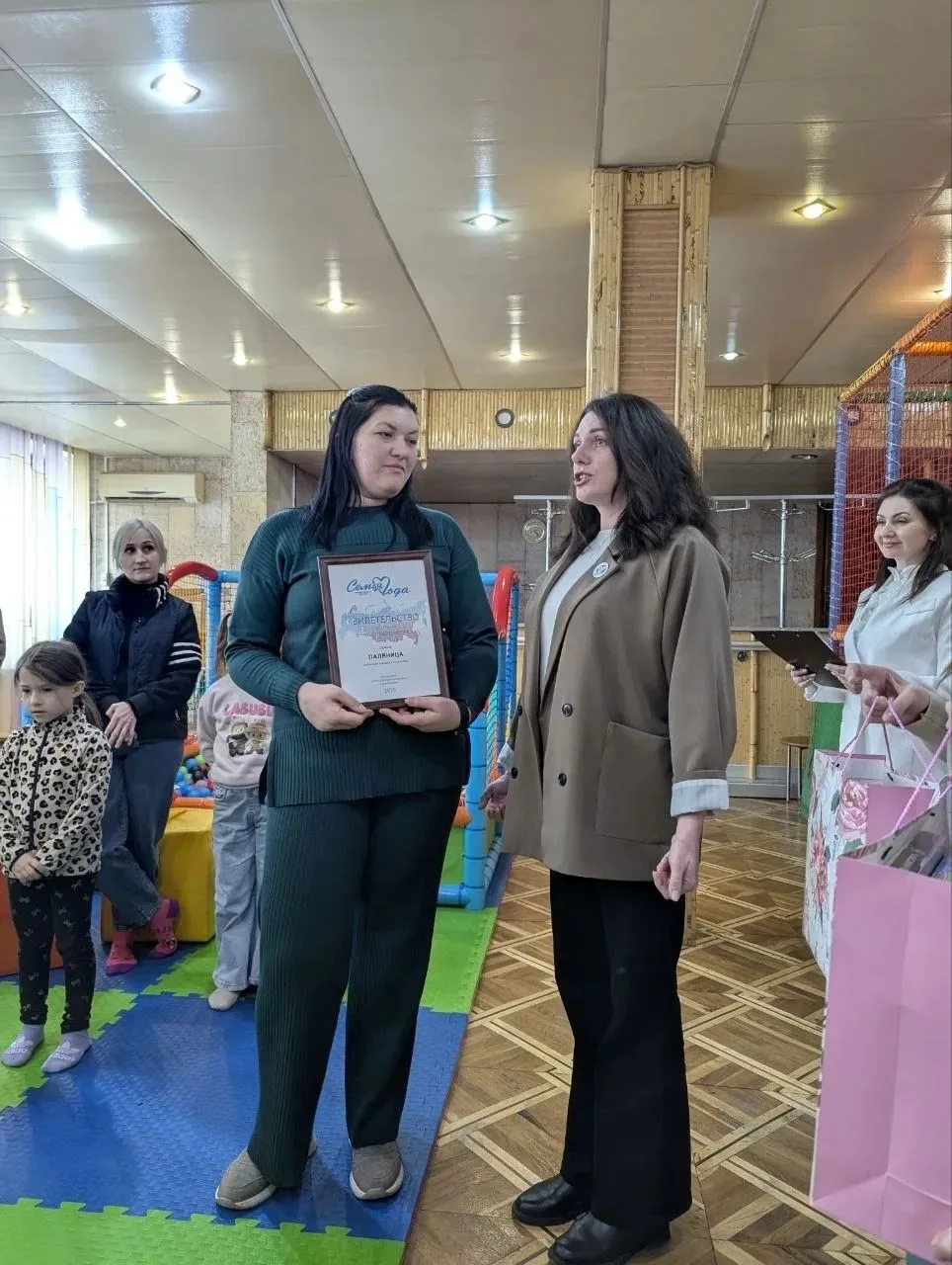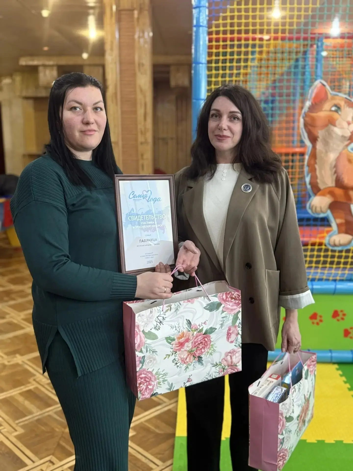 От имени Главы городского город Ровеньки Андрея Рубанцова, от Совета женщин города Ровеньки «Союза женщин России» свидетельство участника Всероссийского конкурса «Семья года» 2025 и подарки вручила муниципальный посол культуры Совета женщин города Ровеньки «Союза женщин России» Елена Шевченко.
