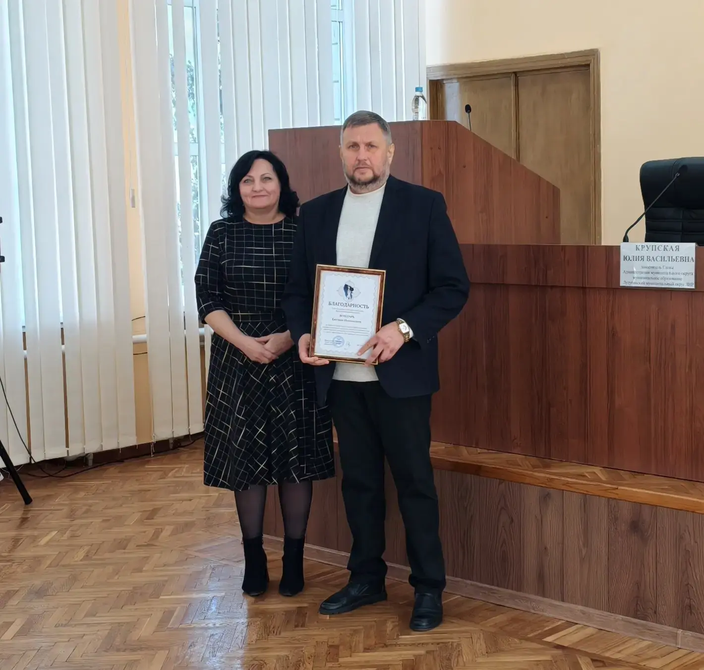 От имени председателя ассоциации «Совет муниципальных образований Луганской Народной Республики» Яны Пащенко Первый заместитель Главы Администрации Лутугинского муниципального округа Оксана Ходыкина вручила Благодарность Главе Лутугинского муниципального округа Евгению Бондарь.