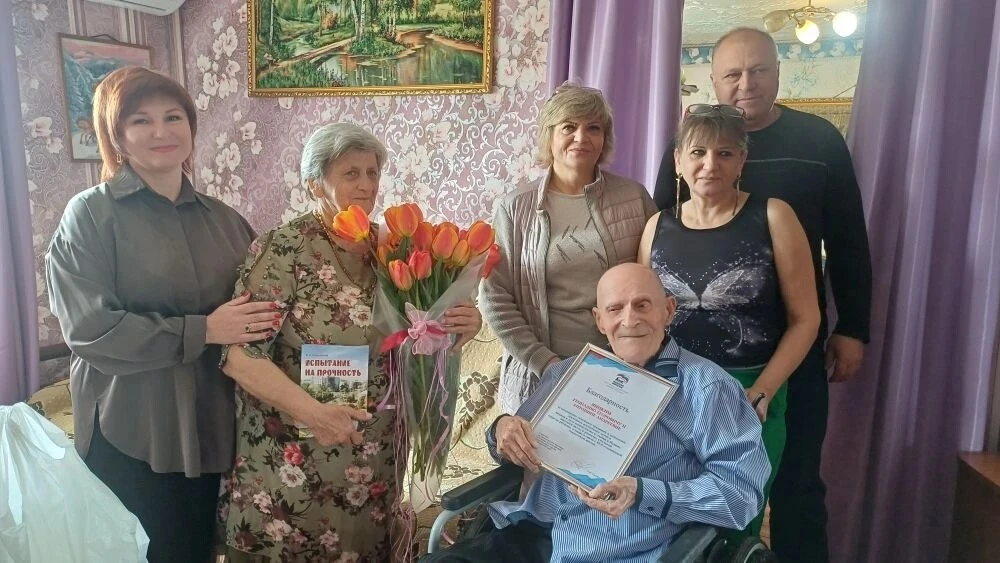 В завершение Лариса Жердева подарила Геннадию Егоровичу и Антонине Андреевне книгу Владимира Романенко «Испытание на прочность» — об истории города Антрацита.