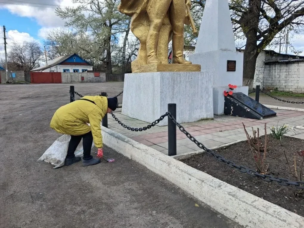 · уборка мусора, сухих веток и листвы на центральной площади, у памятного знака «Воин-освободитель», на остановках и въезде в поселок;