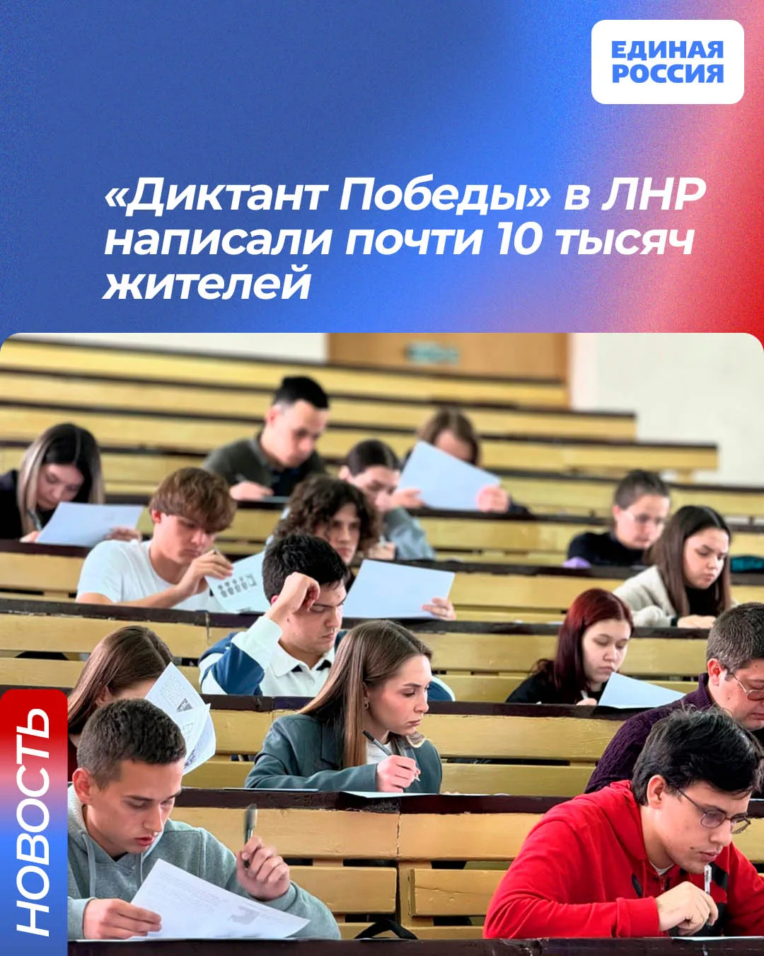 Луганская Народная Республика в четвертый раз присоединилась к международной акции «Диктант Победы». Написать Диктант можно было ка очно – для этого в республике работало более 240 площадок, так и онлайн – на сайте диктантпобеды.рф.