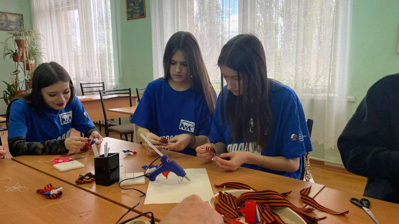 В Луганском колледже строительства, экономики и права активисты Молодой Гвардии приняли участие в творческом мастер-классе, посвящённом изготовлению брошей и значков с Георгиевской лентой.